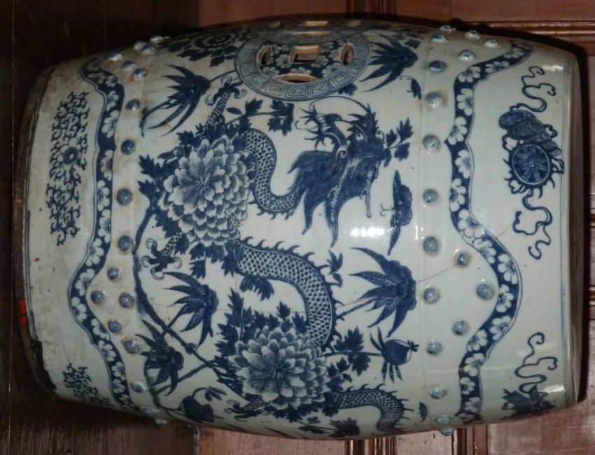 Round hat box with a lid; white with blue trim; embossed on the lid, "R.H. Stearns Company / Boston Chestnut Hill"