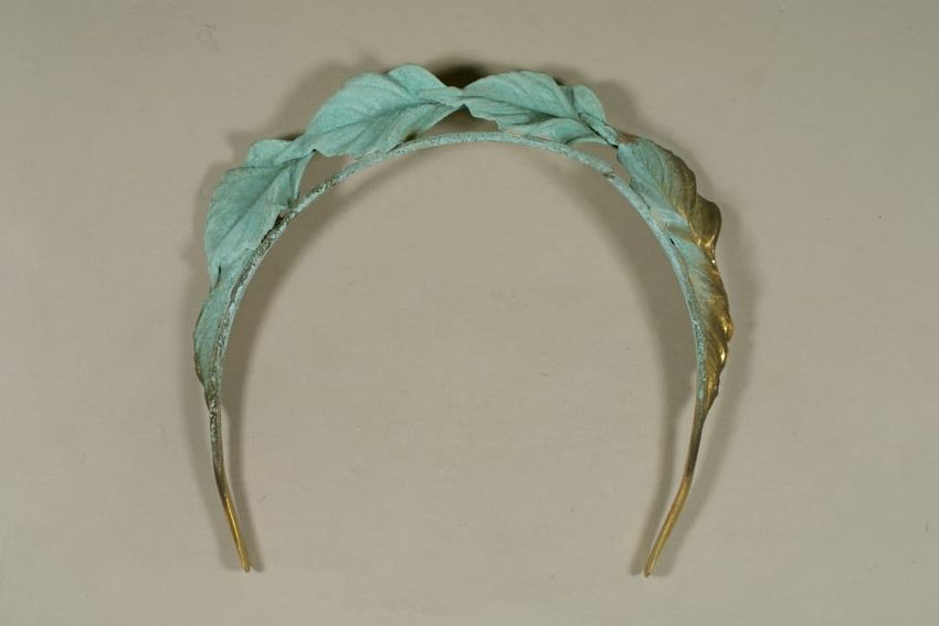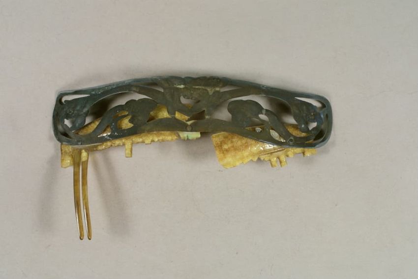 Gilt metal tiara comb with pierced top featuring foliage, scroll and run designs, thirty-two teeth, and three hinged bands.
