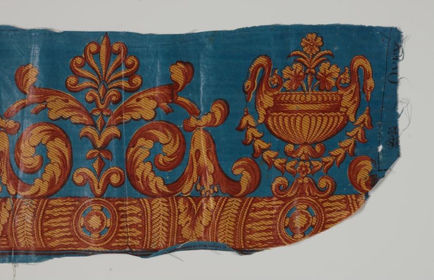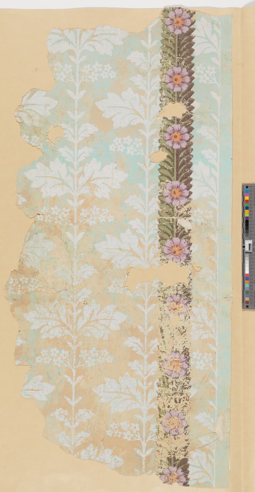 Wallpaper fragments from the Lincoln Streeter House in Brimfield, Massachusetts. Scrolling vine and sprig pattern printed in green, brown, white, gray, yellow and liquid mica on a pink ground.