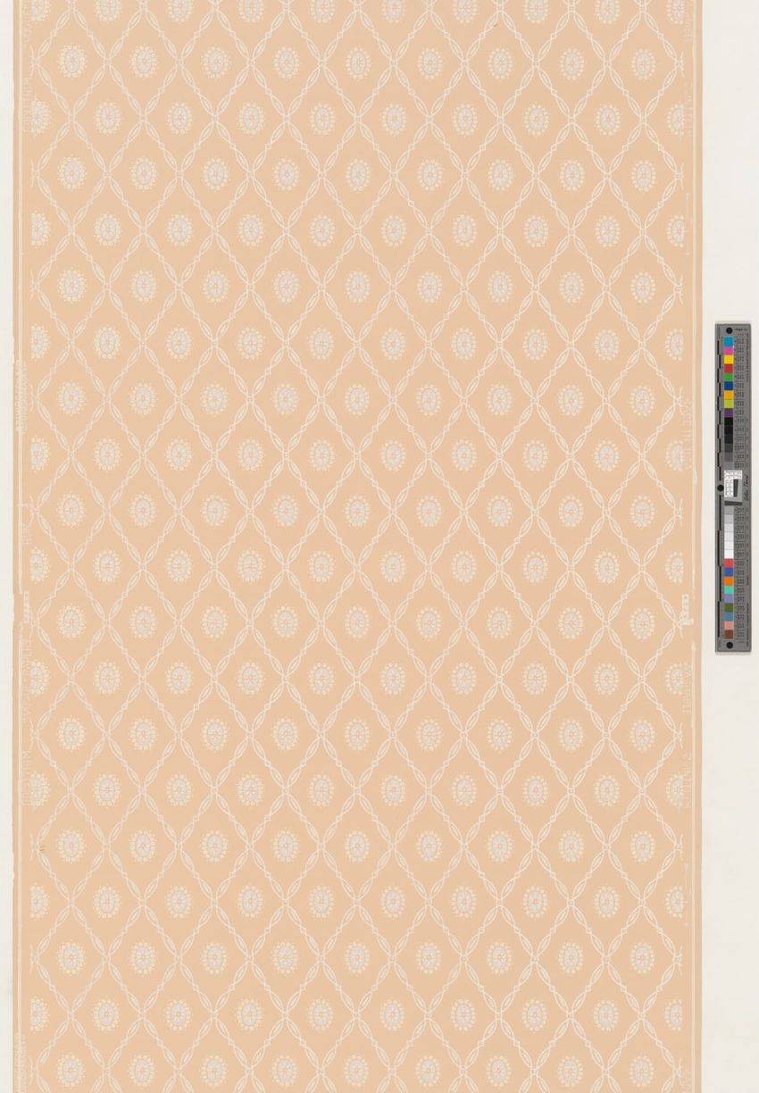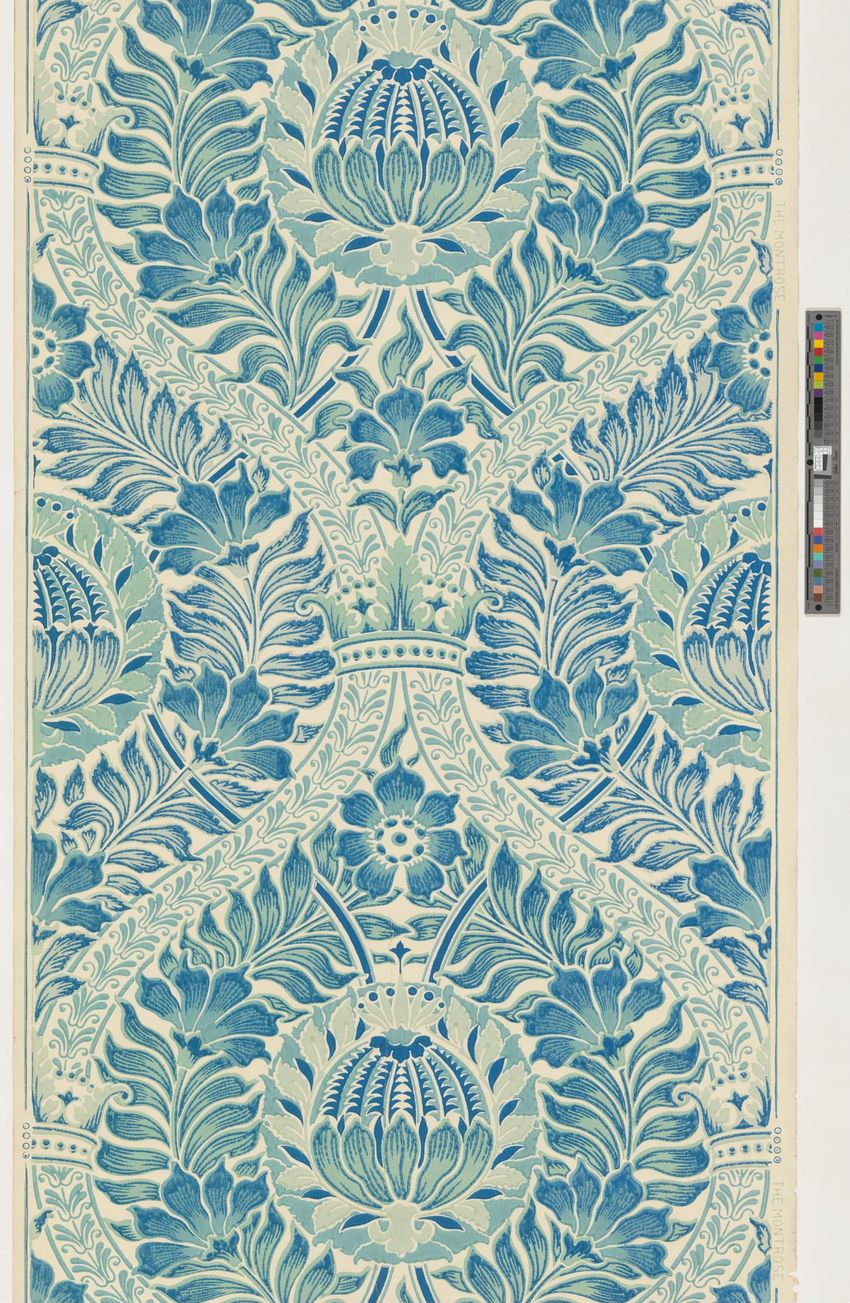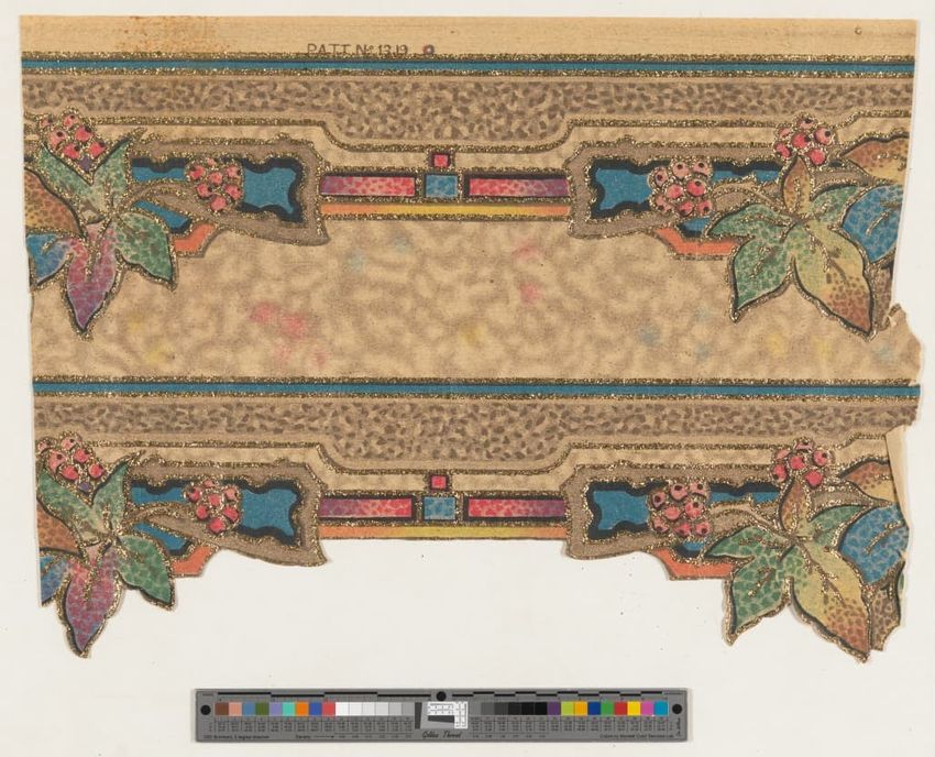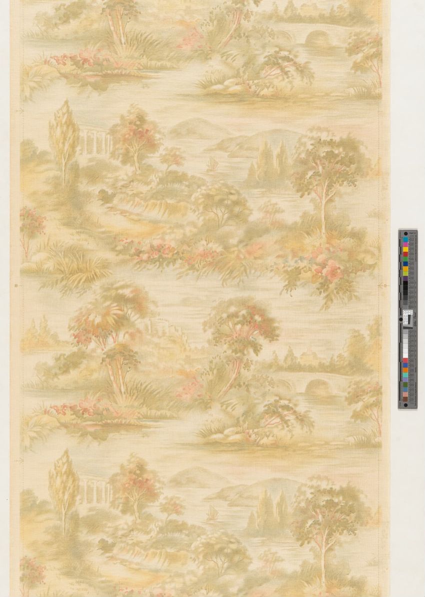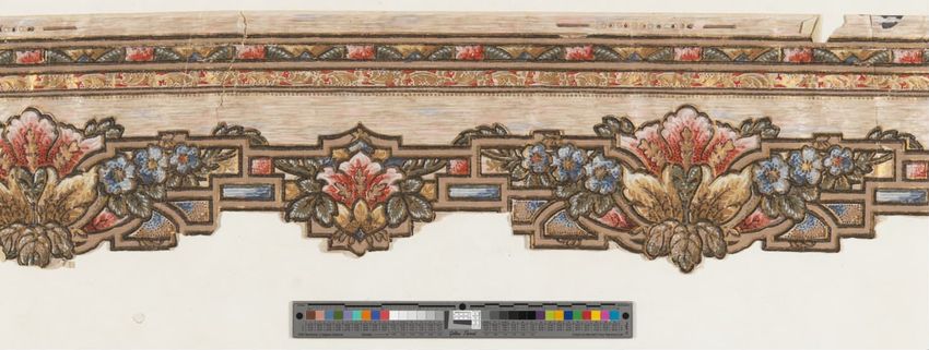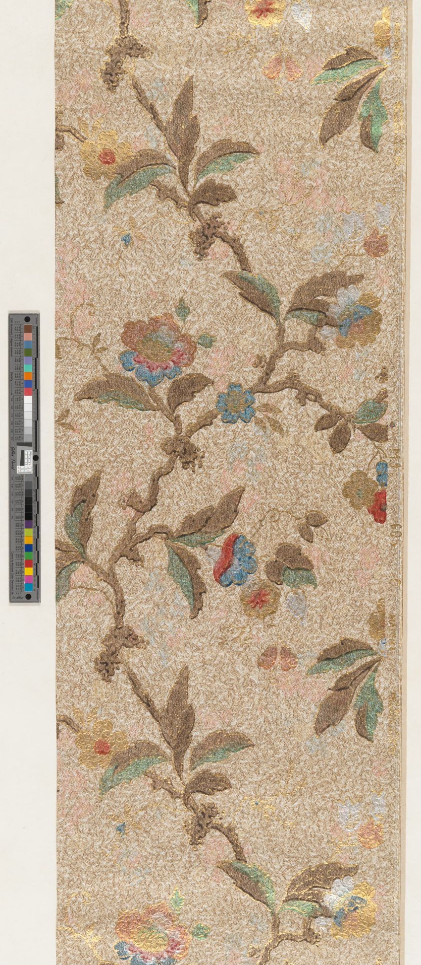 Partial roll. Large-scale, meandering, woody vine sprouting stylized blossoms. Printed in red, rose, pink, two lavenders, three greens, two blues, yellow, two browns, tan and white. Drop match.