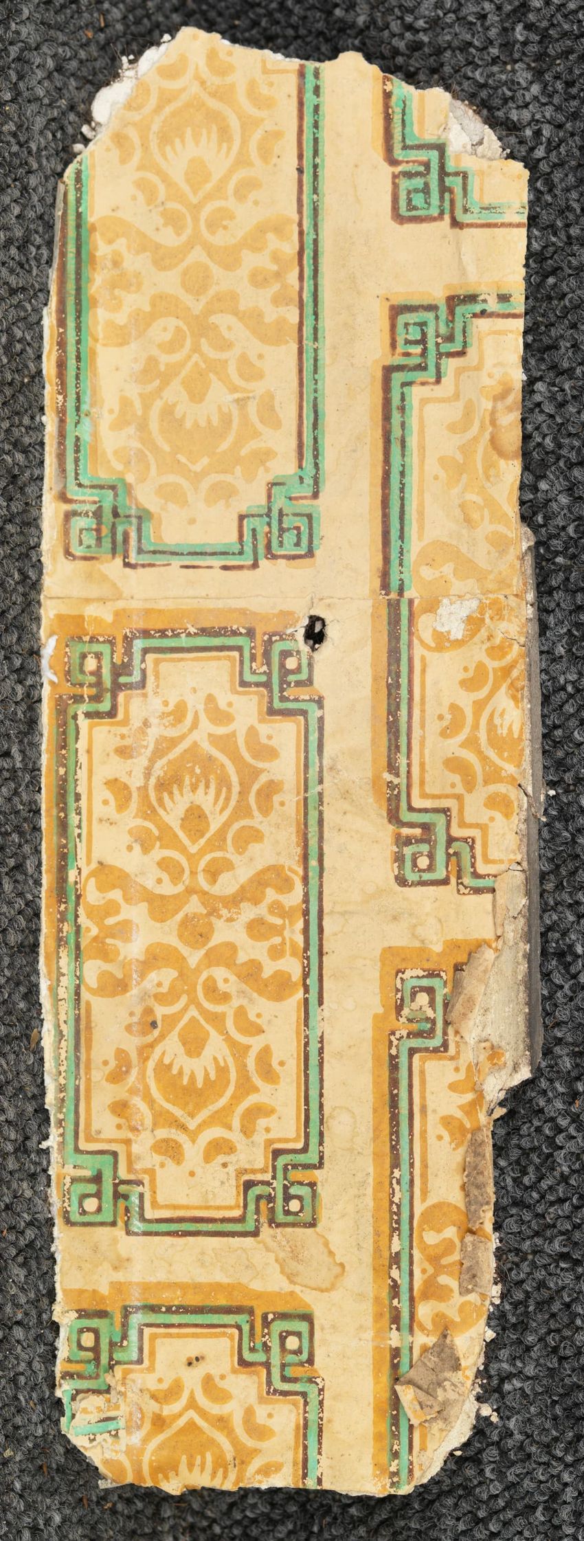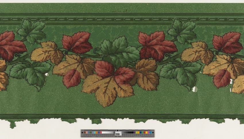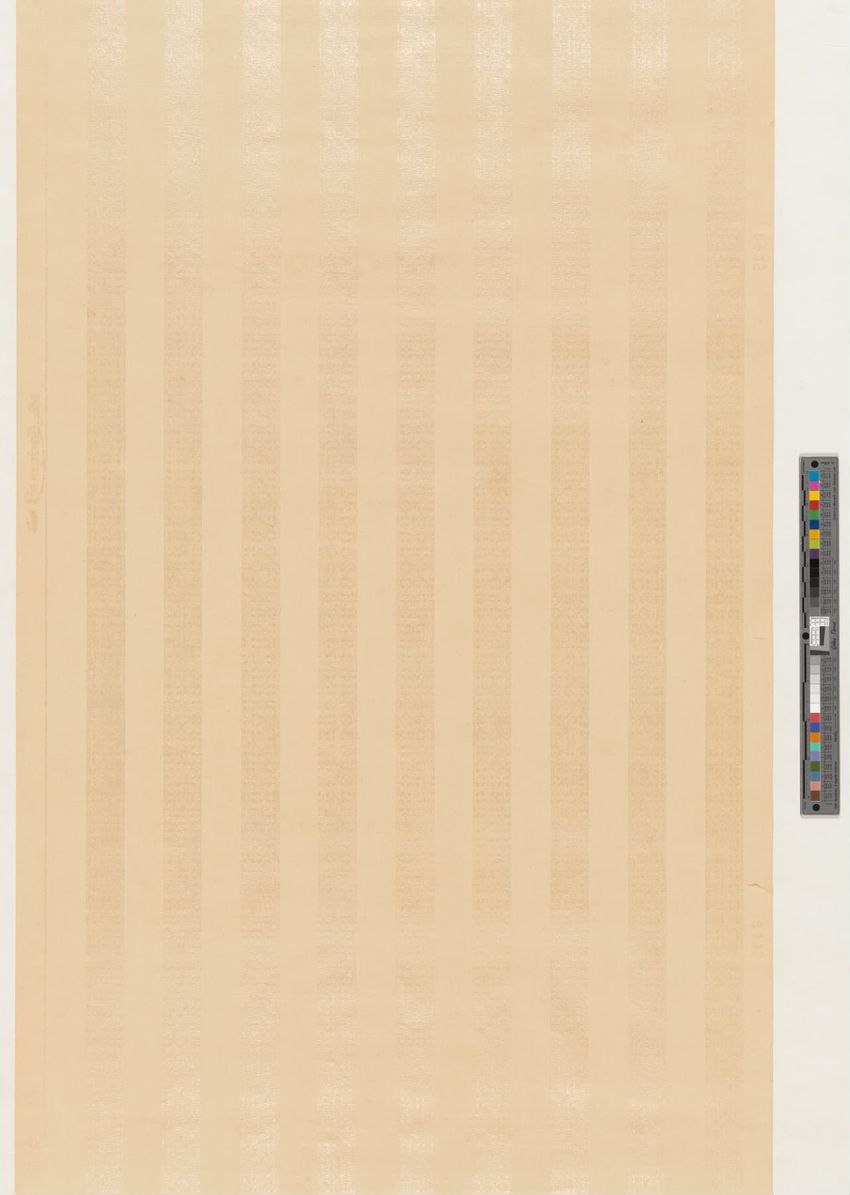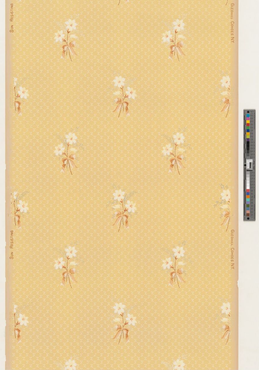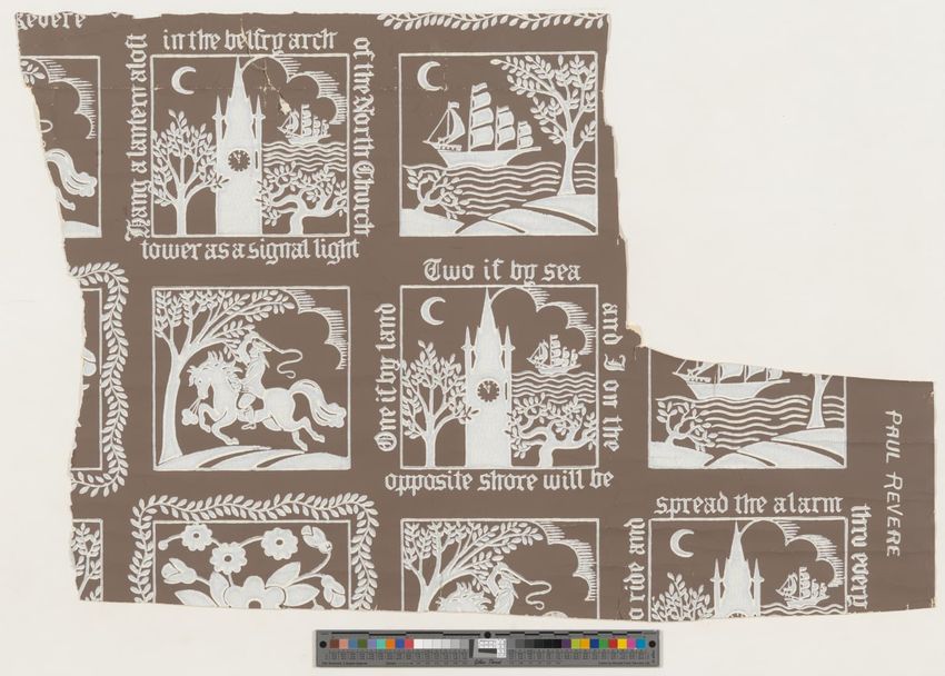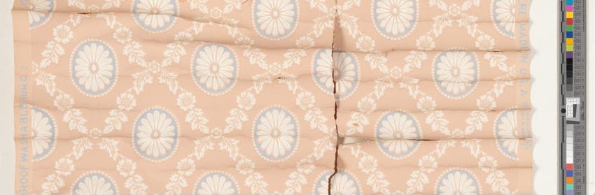 Partial roll. Large-scale, meandering, woody vine sprouting stylized blossoms. Printed in red, rose, pink, two lavenders, three greens, two blues, yellow, two browns, tan and white. Drop match.