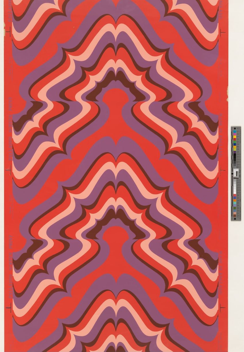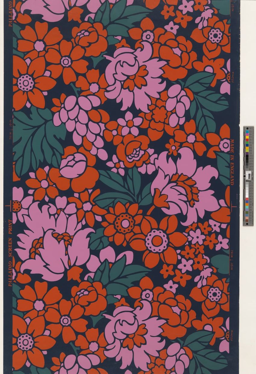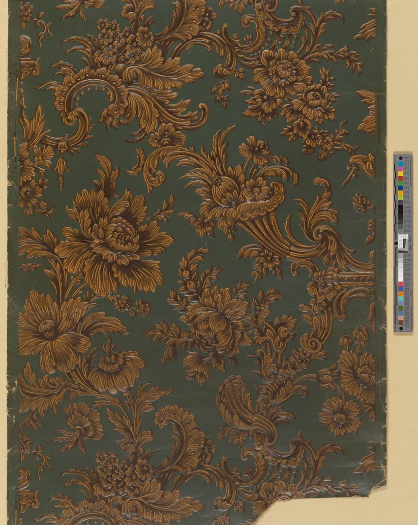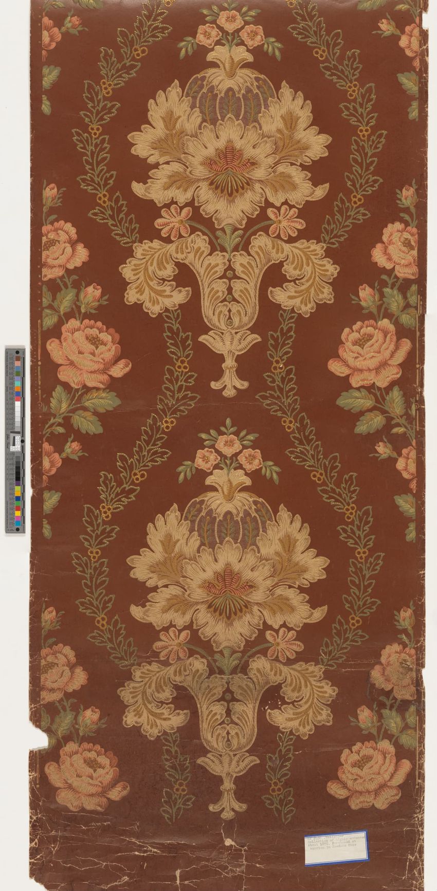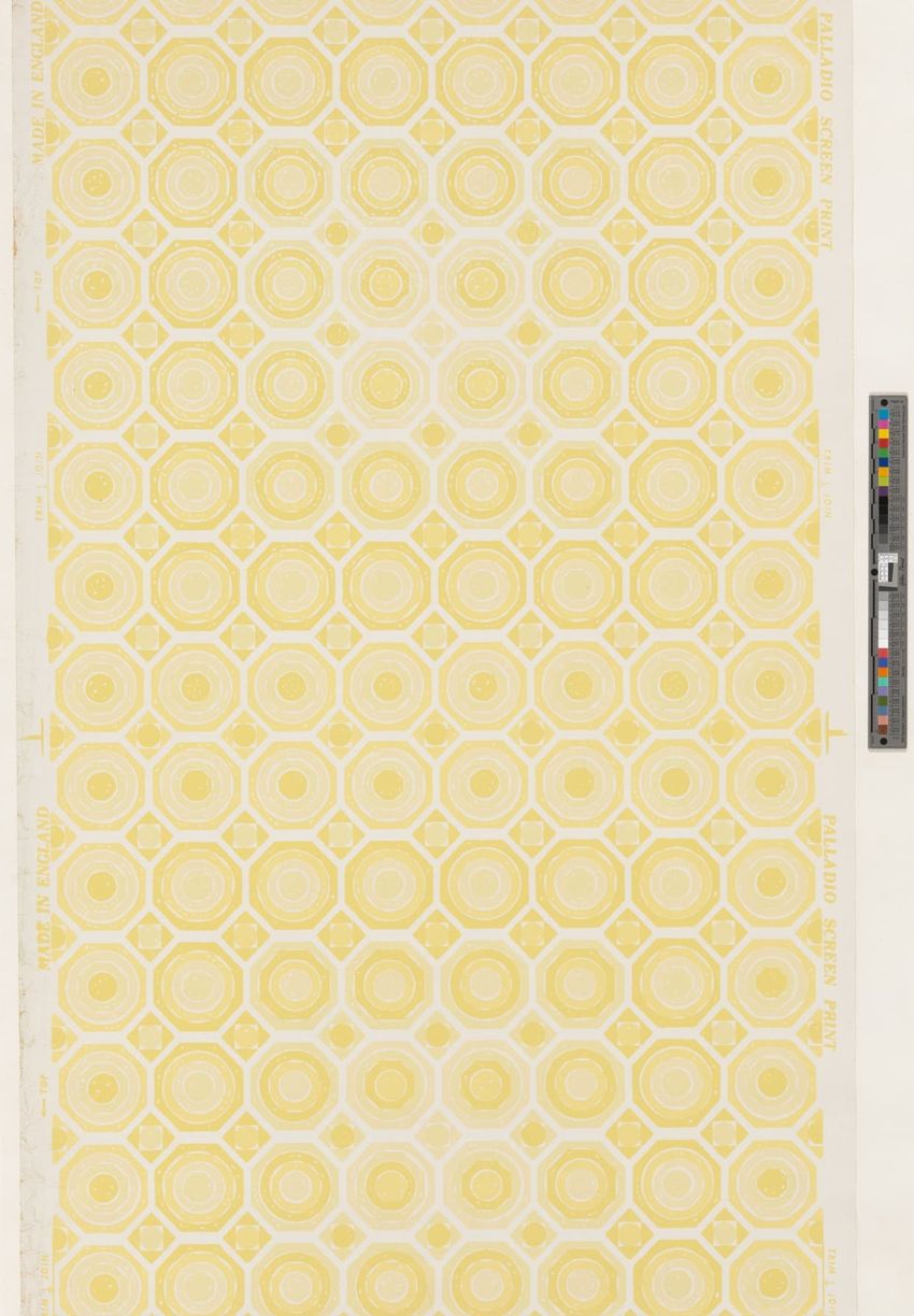 Unused sample. Striped pattern with bouquets springing from a foliated vase. Printed in yellow, pink, green, white, grey, violet, liquid mica and gold on a yellow ground.