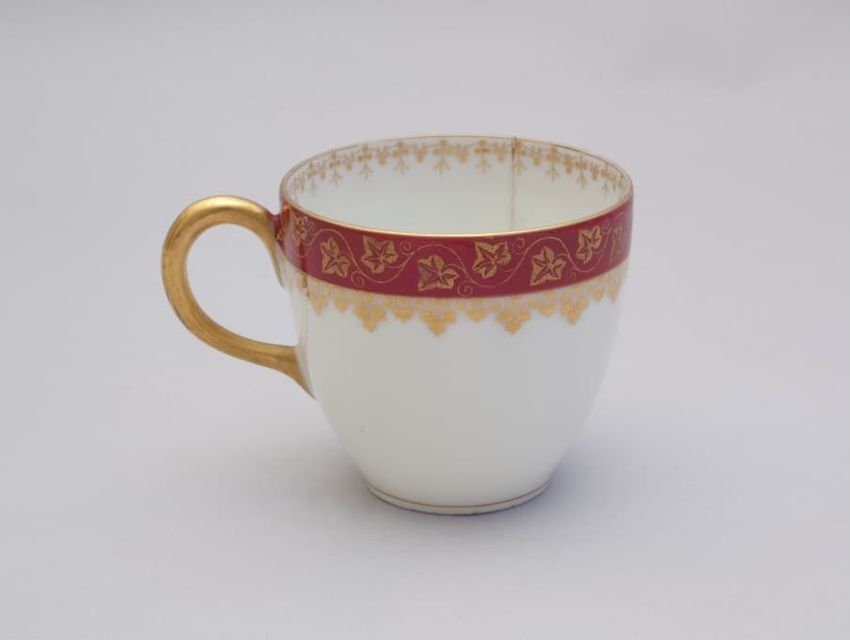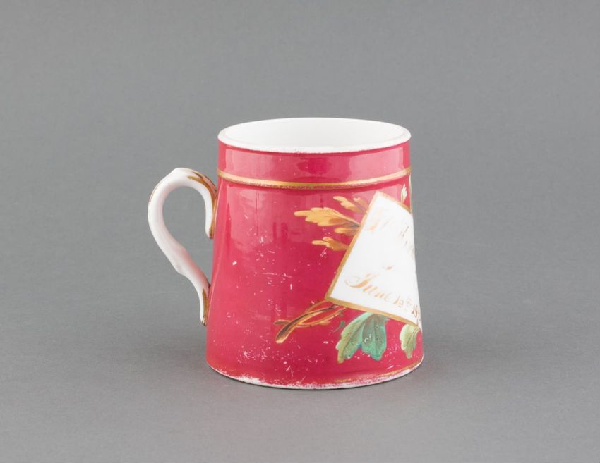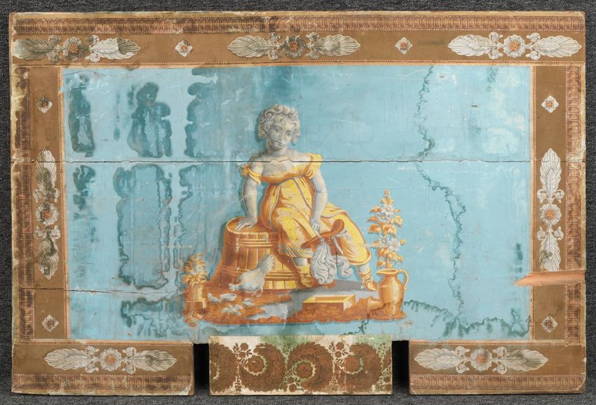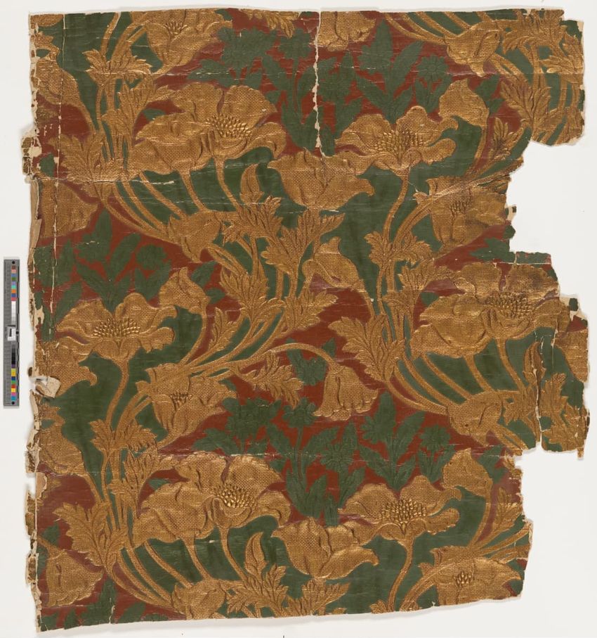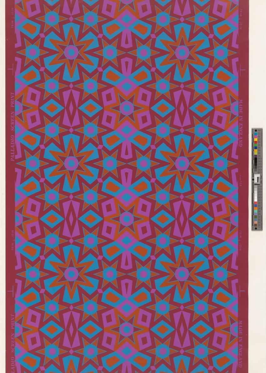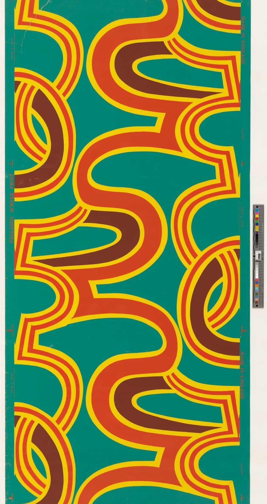 Unused sample. Striped pattern with bouquets springing from a foliated vase. Printed in yellow, pink, green, white, grey, violet, liquid mica and gold on a yellow ground.