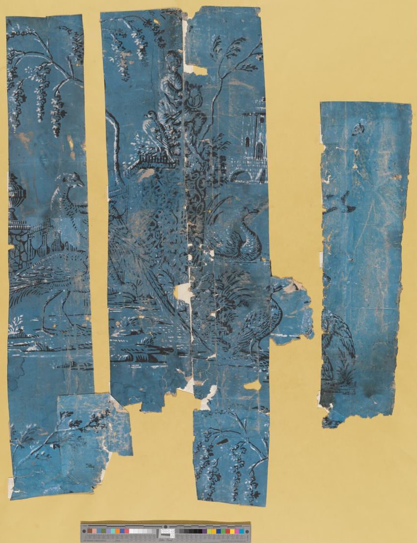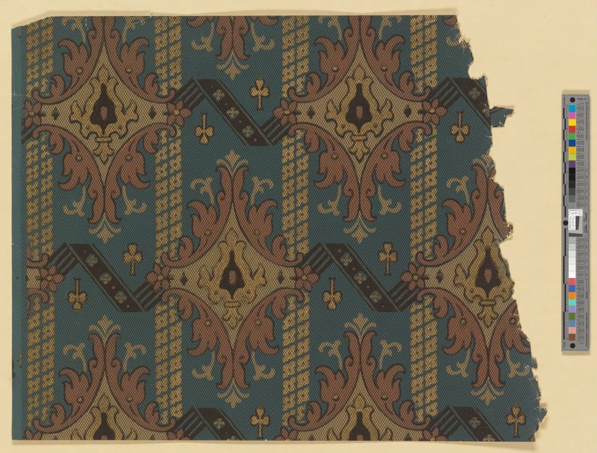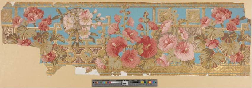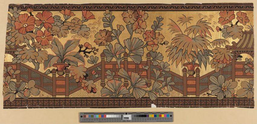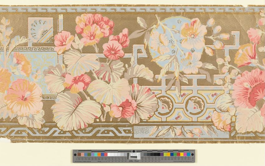 Anglo-Japanese border, aesthetic style, with cherry blossoms; fret work, exotic flowers, and asymmetrical lattice. Printed in light blue, three pinks, grey, ochre, cream, and silver.