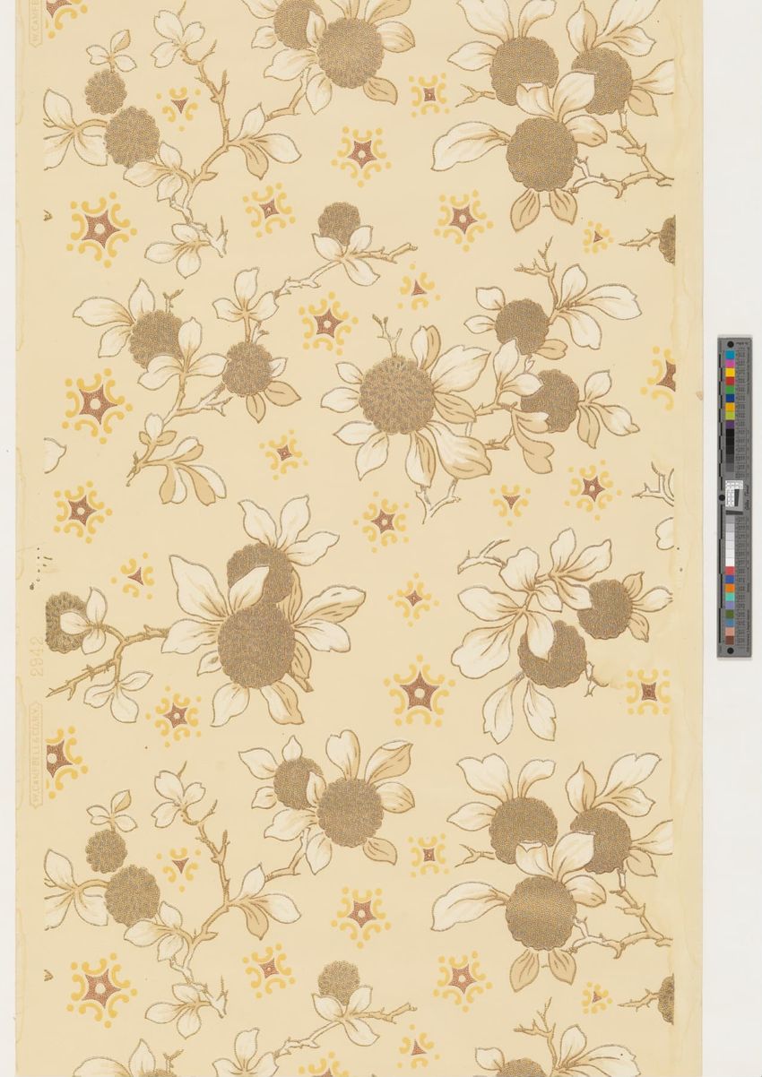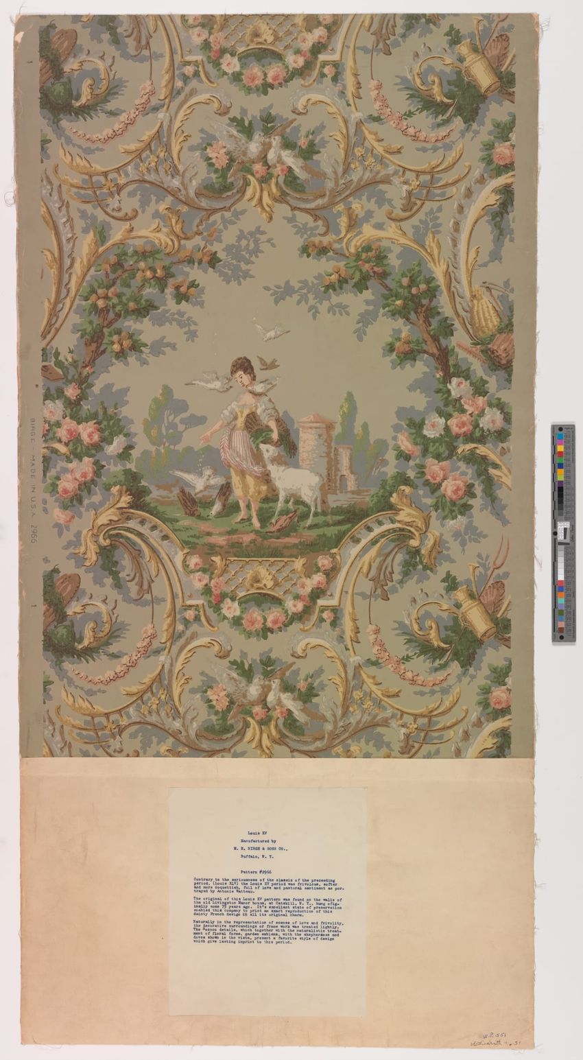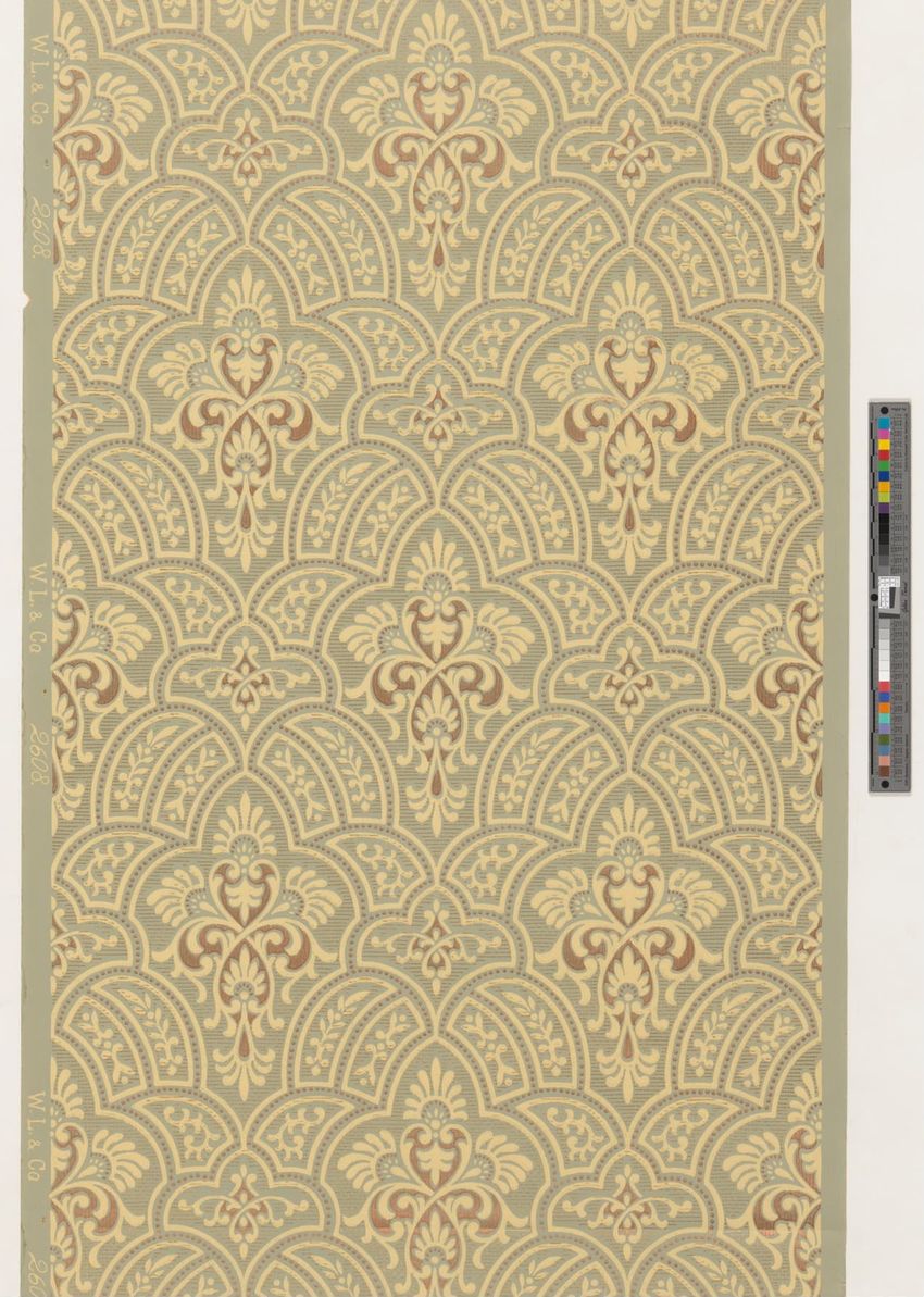 Unused end of a roll of wallpaper. Scenery figure with views of a spired and turreted building next to a body of water. Scenic views are framed by a fantastical structure of bridges, trees and meadows. Printed in three browns, three greys, two greens, ochre, light blue, red and white on a white, sat...