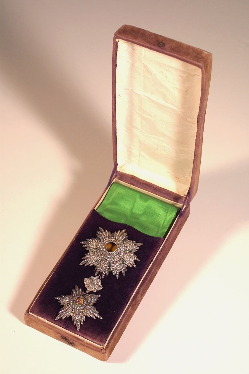 b) Smaller medal, six-sided star-shaped; brooch set with faux diamonds; cent...