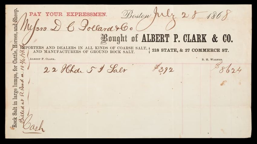 Billhead for Albert P. Clark & Co., importers and dealers in all kinds of coarse salt and manufacturers of ground rock salt, 218 State & 27 Commerce Street, Boston, Mass., 1868