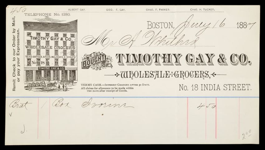 Billhead for Timothy Gay & Co., wholesale grocers, No. 18 India Street, Boston, Mass., 1887