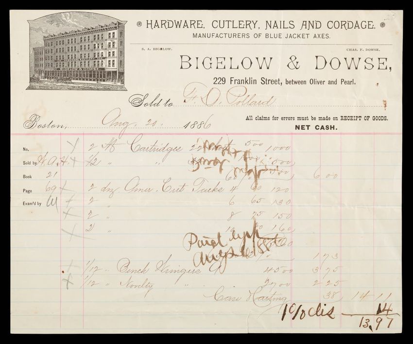 Billhead for Bigelow & Dowse addressed to F. D. Pollard. Pollard is charged for cartridges, cut tacks, and other hardware. The front of the billhead also features a print of Bigelow and Dowse's storefront.