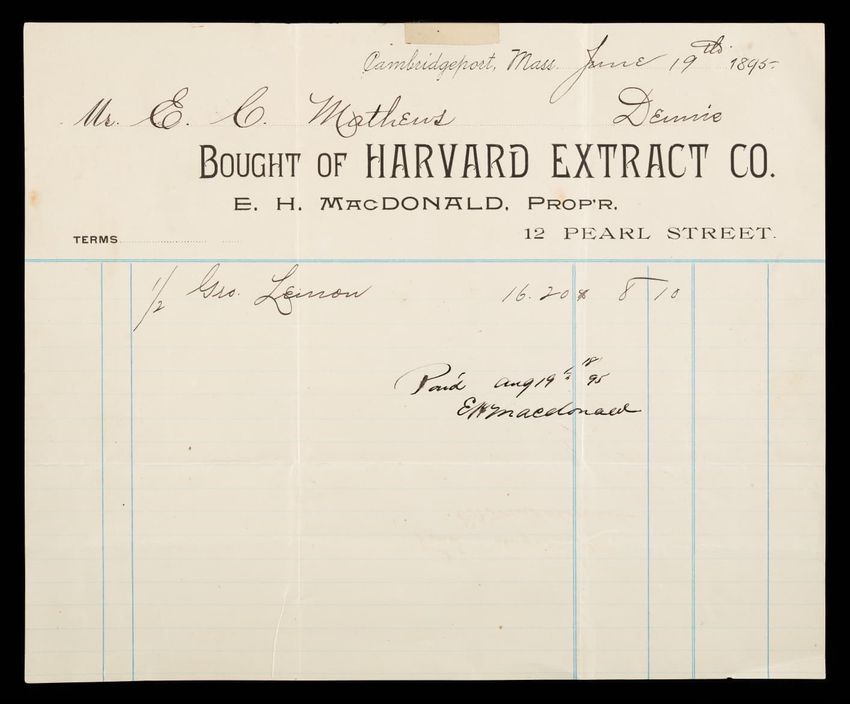 Billhead for Harvard Extract Company, E H. MacDonald, proprieter, 12 pearl Street, Cambridgeport, Cambridge, Mass., 1895
