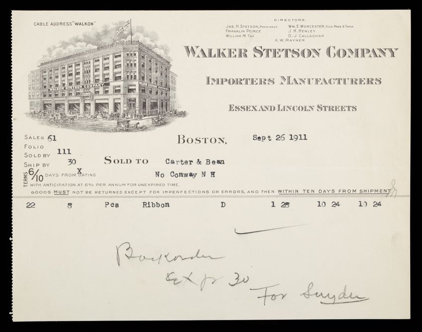 Billhead for Walker Stetson Company, importers manufacturers, Essex and Lincoln Streets, Boston, Mass., 1911
