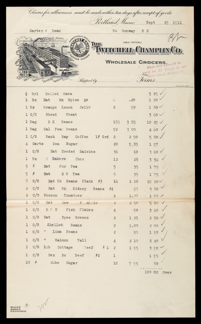 Billhead for The Twitchell-Champlin Co., wholesale grocers, Portland, Maine, 1911