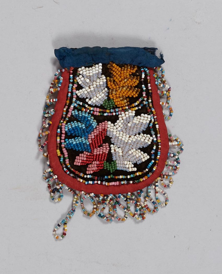 A small polychrome glass beaded coin purse likely made by an previously known Native American craftsperson. Glass bead flowers in white, yellow, blue, and pink on a black textile outlined with a mixed color doulbe row of beads, red cotton tape binding with looped mixed color beaded fringe; top openi...