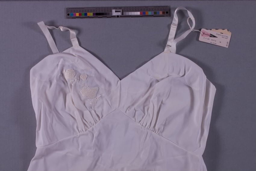V-neck. Gathered breast cups. Satin shoulder straps. Embroidered floral spray motif and scallops at breast and around bottom hem.
