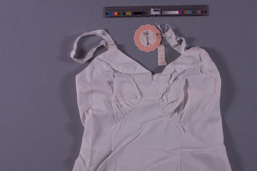 V-neck: Gathered breast cups. Satin shoulder straps. Embroidered sprg motif and scallops at breast and around bottom hem. Double lined front panel.