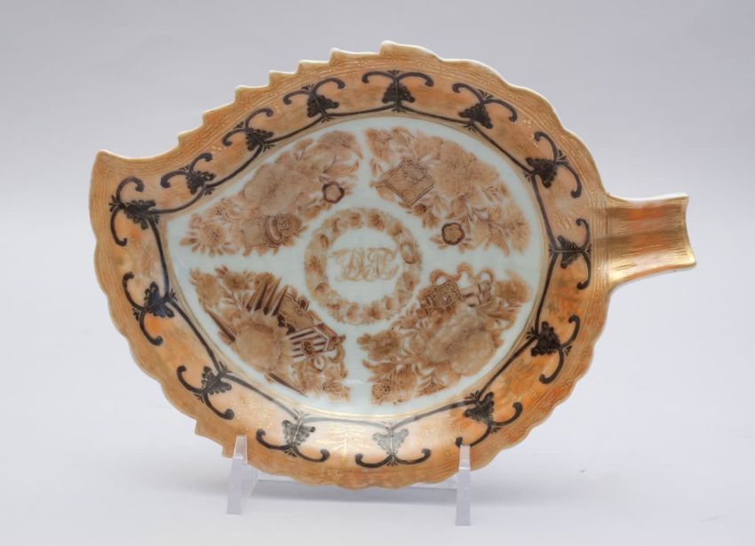 Porcelain leaf dish in an orange, brown, sepia and gold Fitzhugh pattern consisting of clusters of vegetation around a circle of foliage enclosing the monogram "DAP" in gold. Border is a stylized scroll, swag and palmette design in black and gold.