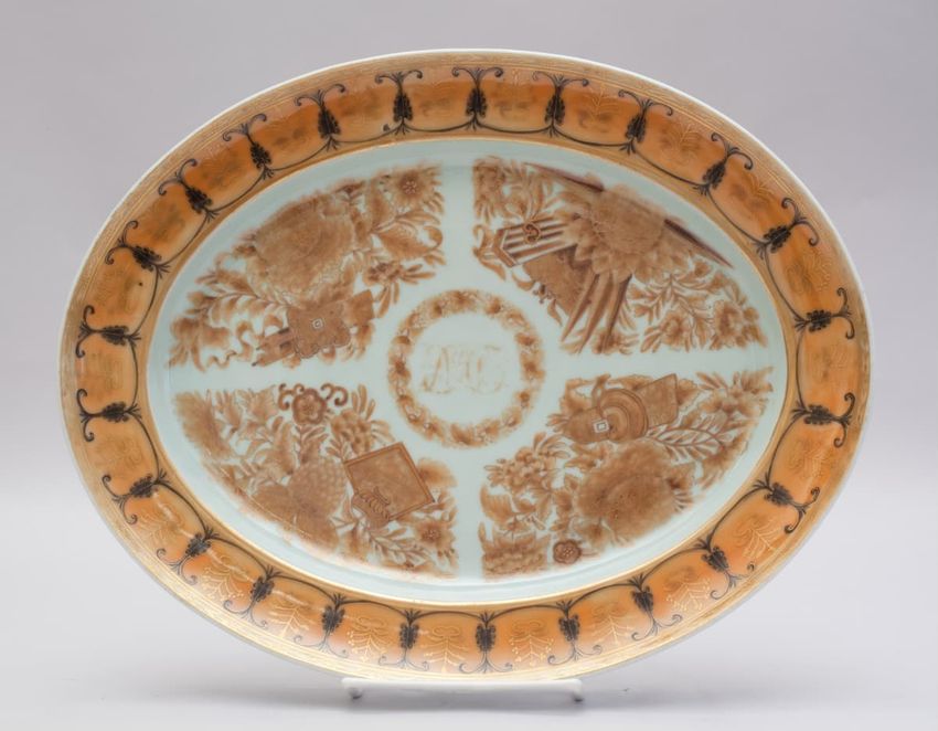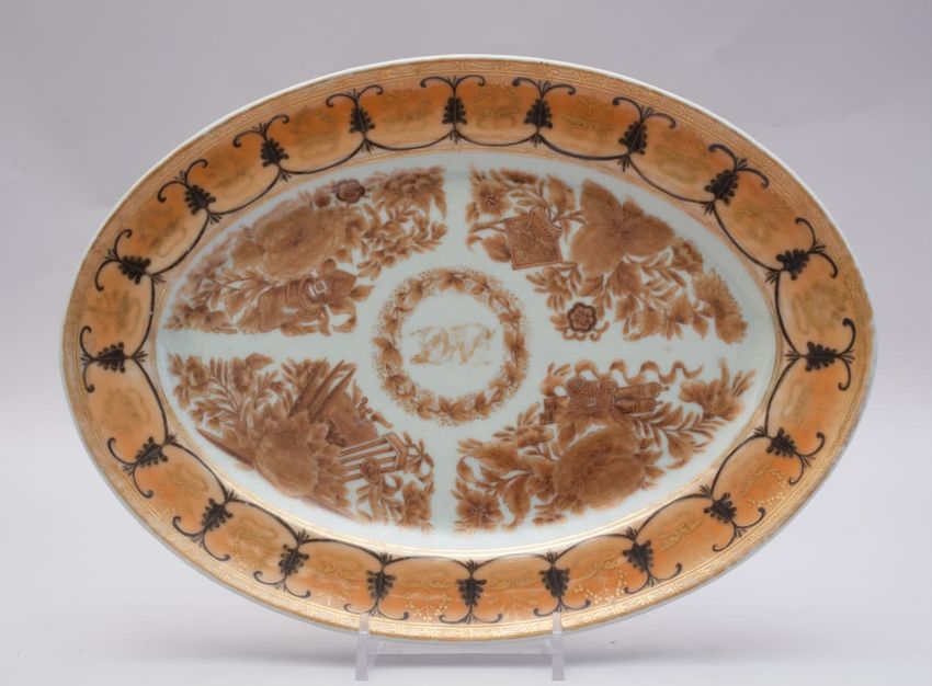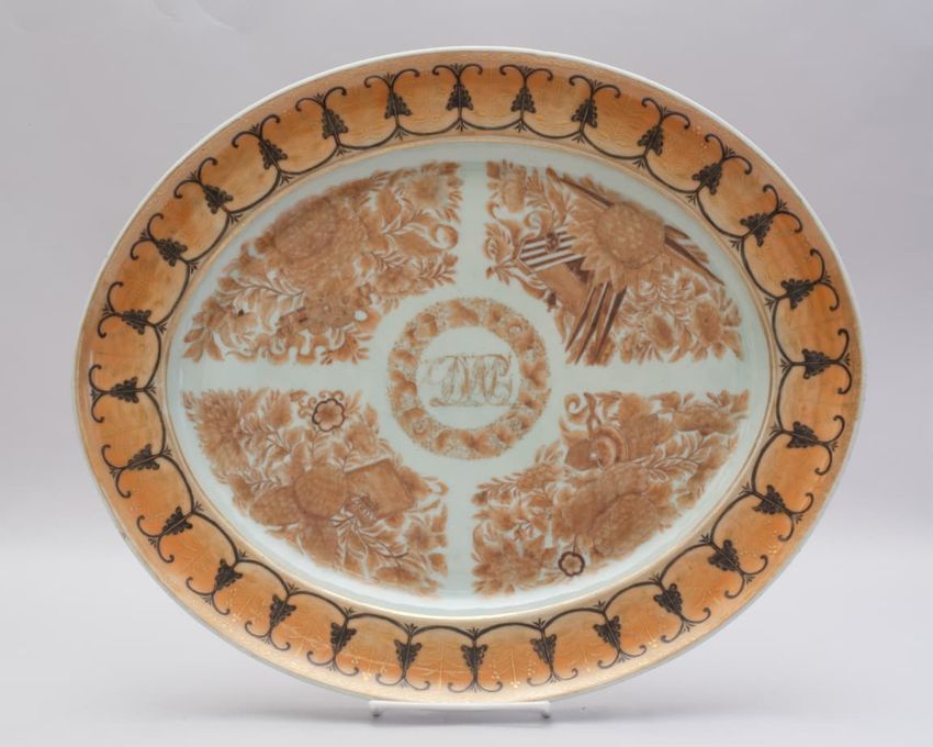 Porcelain oval platter in an orange, brown, sepia and gold Fitzhugh pattern consisting of clusters of vegetation around a circle of foliage enclosing the monogram "DAP" in gold. Border is a stylized scroll, swag and palmette design in black and gold.