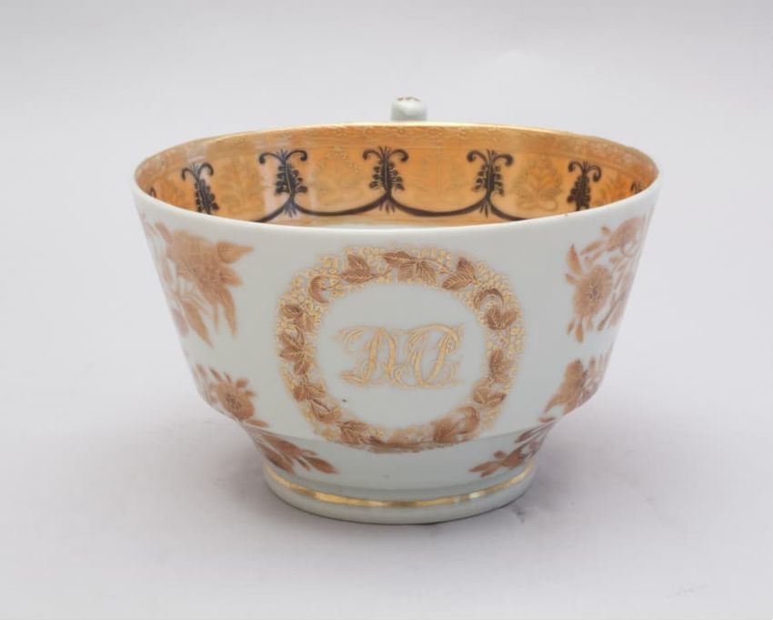 Porcelain coffee cup with a square handle and finger rest in an orange, brown, sepia and gold Fitzhugh pattern consisting of clusters of vegetation around a circle of foliage enclosing the monogram "DAP" in gold. Border is a stylized scroll, swag and palmette design in black and gold.