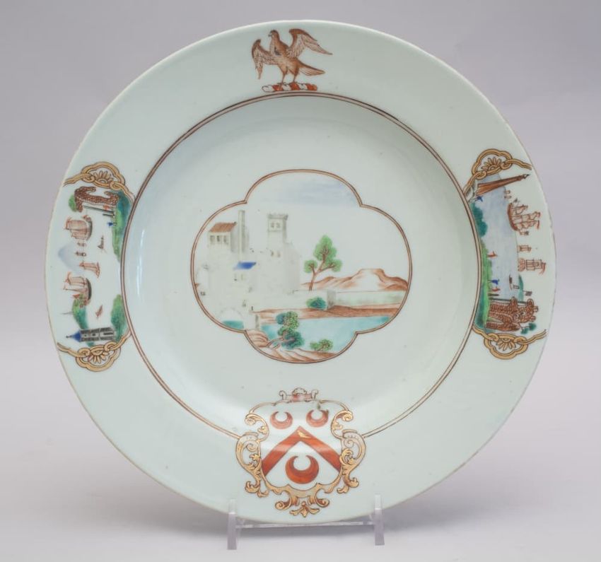 Armorial porcelain dinner plate with painted polychrome decoration consisting of a central four lobed medallion with a scene of a building next to a body of water, rim features two panels with harbor scenes, a splayed eagle with a black bird on its chest, and a coat-of-arms with a shield with three ...
