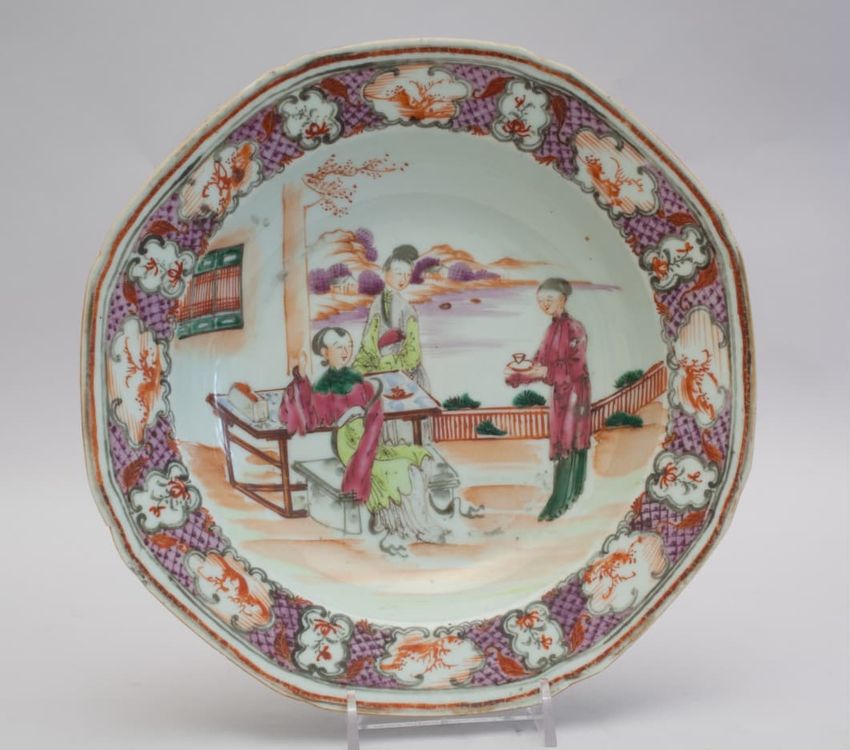 Octagonal porcelain soup plate in Mandarin pattern of a central scene of three women around a table by a river, the rim features a band with a purple diaper design reserved with alternating small and large panels of orange flowers and vegetation, orange an.d gold bands around rim