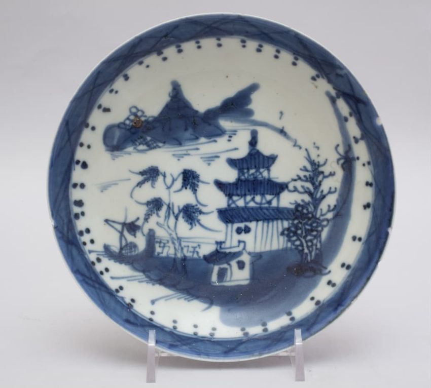 Porcelain saucer in blue and white Canton pattern with central pagoda, river and mountain scene surrounded by a blue band with an X design.