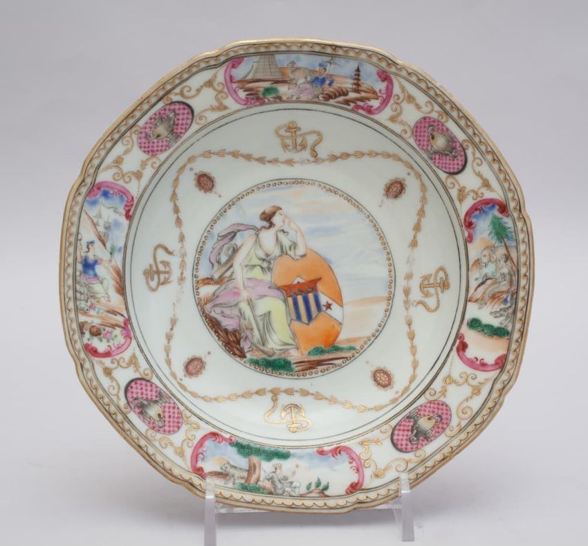 Armorial porcelain saucer with painted polychrome design with a central design within a circle of a classical female figure leaning against two overlapping coat-of-arms, one is an orange oval with a white V and stars, the other is a blue, gold, and red shield with three birds. Central design is fram...