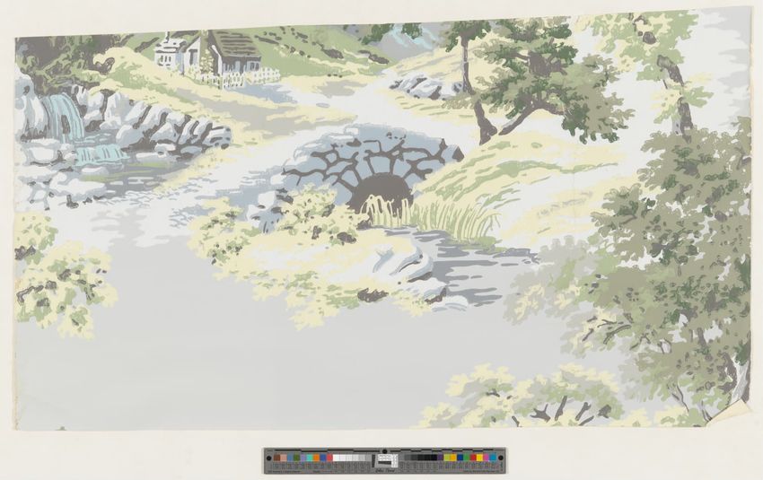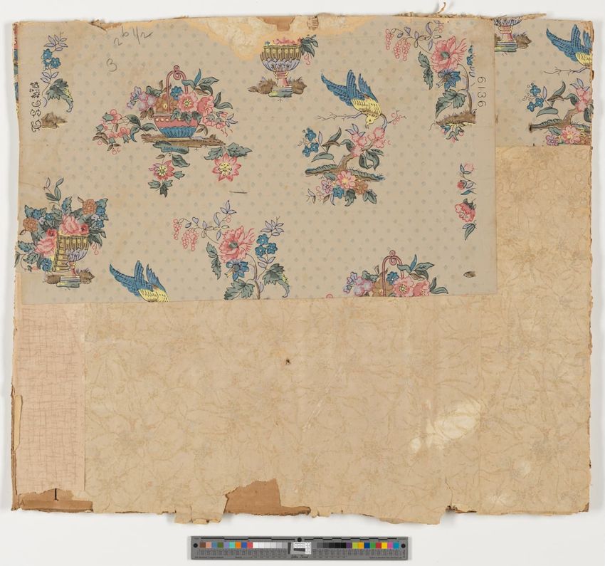 Wallpaper fragment, "The Queen Anne", Pattern 6136, Floral trees, birds, and urns printed in pinks, blues, and yellow on tan ground. Wallpaper glued to cardboard flattened cardboard box and then affixed to the wall.