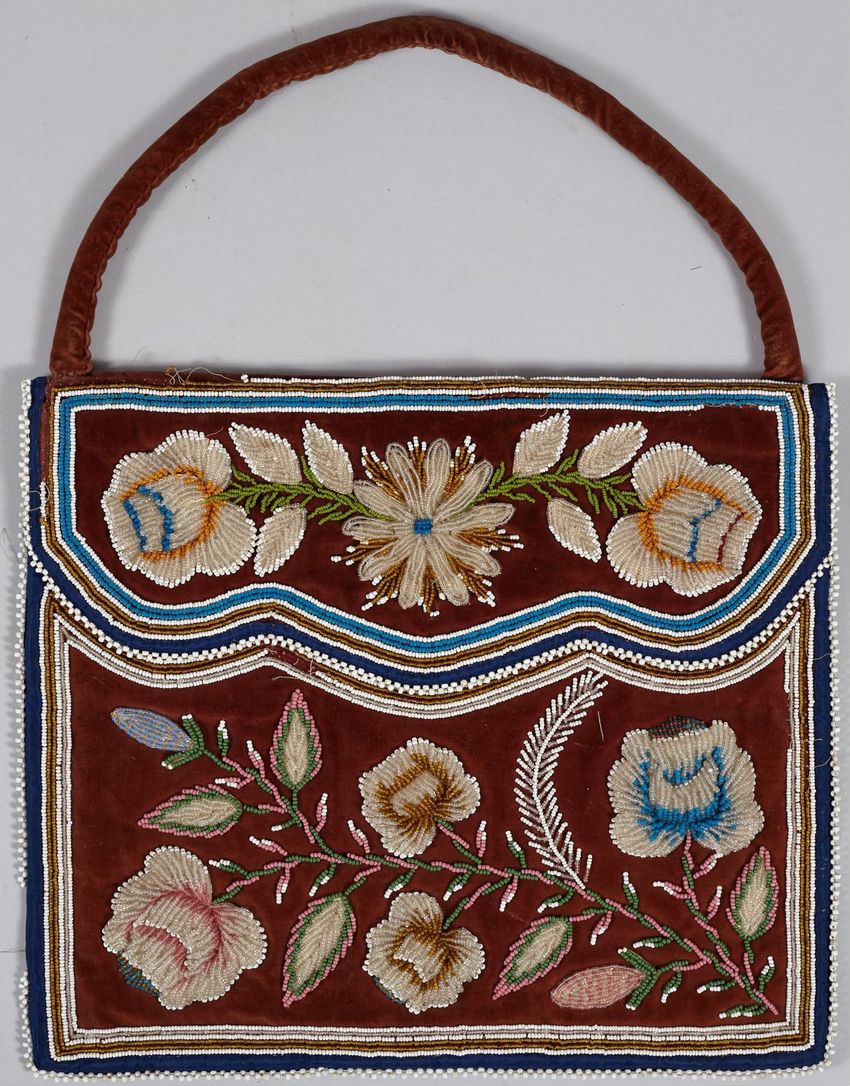 A dark red / brown velvet mail flap style purse or handbag, likely made by Native American craftspeople with velvet covered cord handle or strap. Adorned with three dimensional beadwork in floral motifs and edged with beadwork.