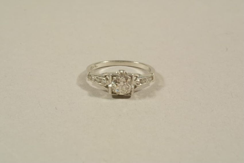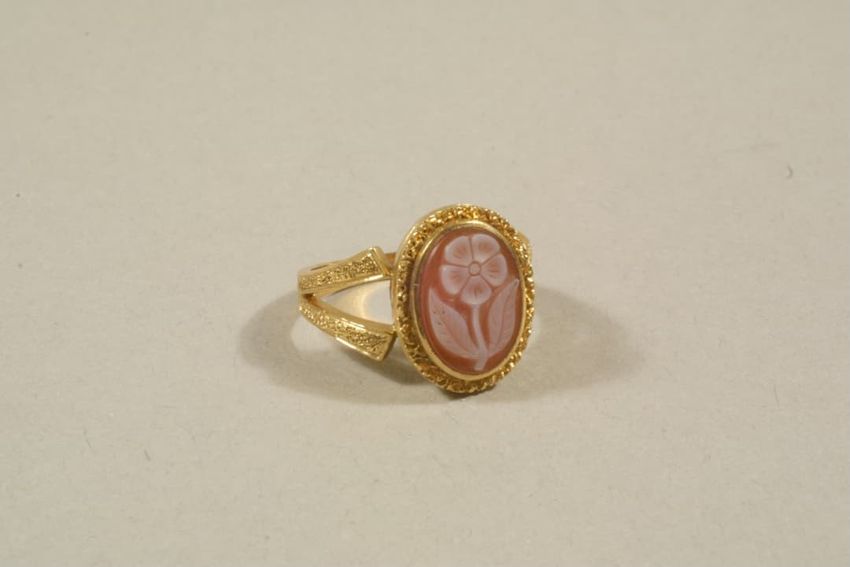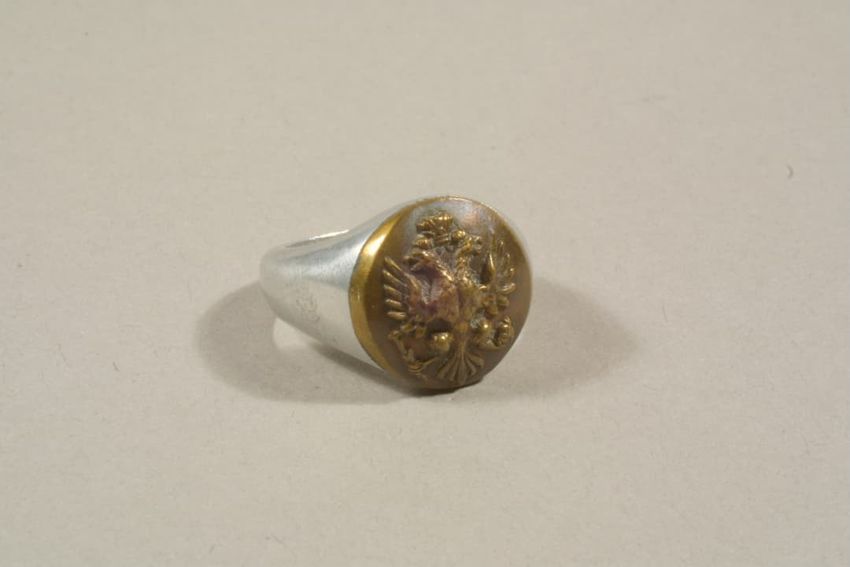 Silver oval locket, front has an applied gold cipher of an entwined endless knot and the letter C, inside compartment contains a lock of blonde hair under glass and a newspaper clipping, loop attachment at top.