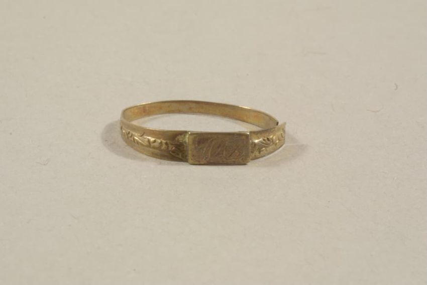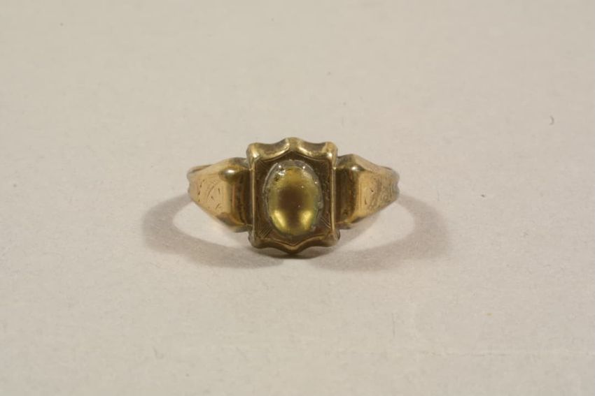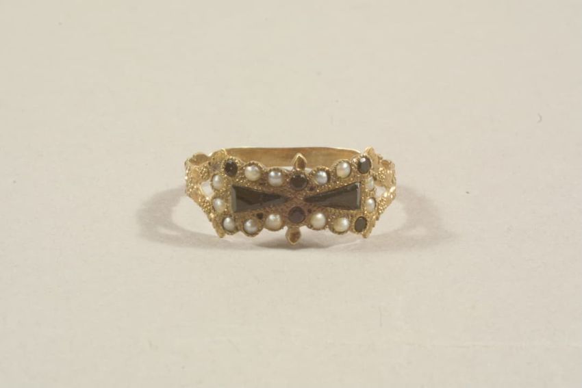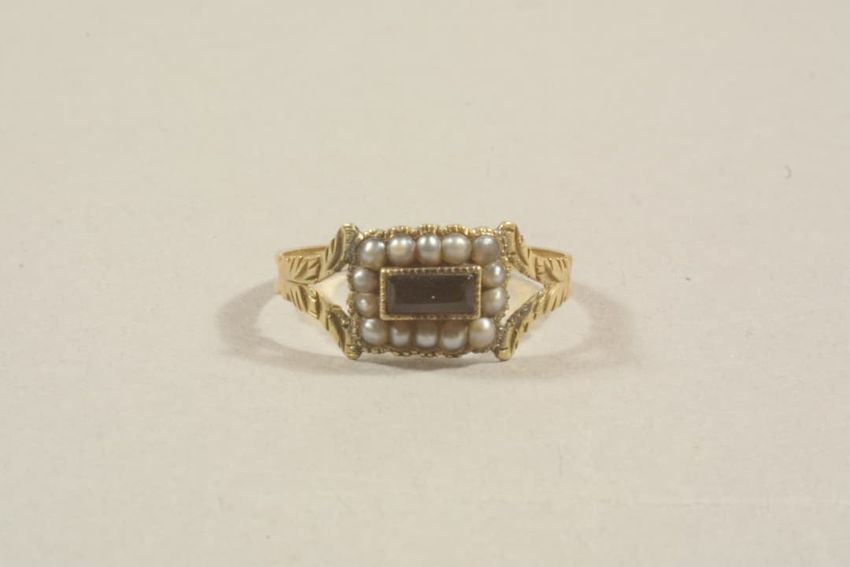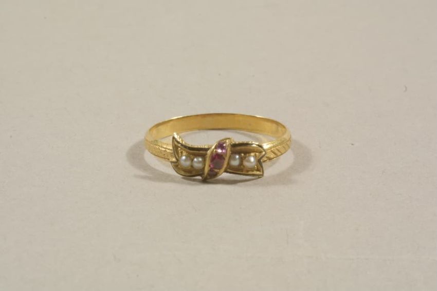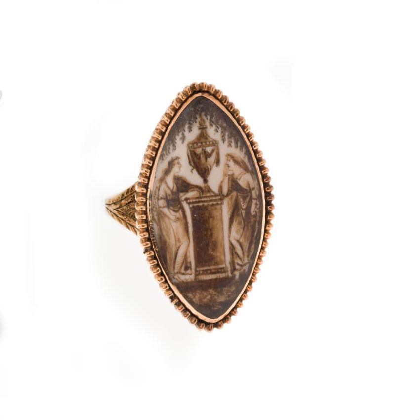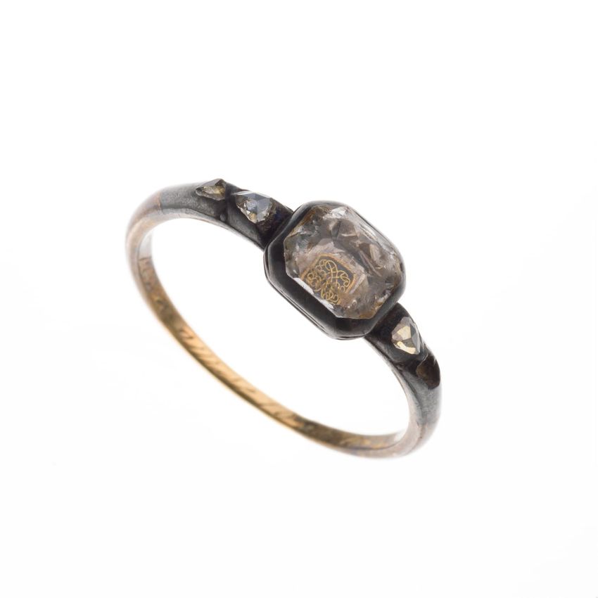 This ring is set with a rectangular, faceted paste stone over a gold twist cipher. Two smaller pastes flank each side. Fitting the eighteenth-century style, the pastes were set in silver, while the ring band is gold. The inside of the band is inscribed with a moral aphorism to the future wearer: "Le...