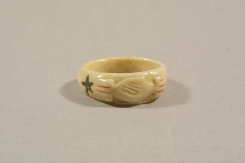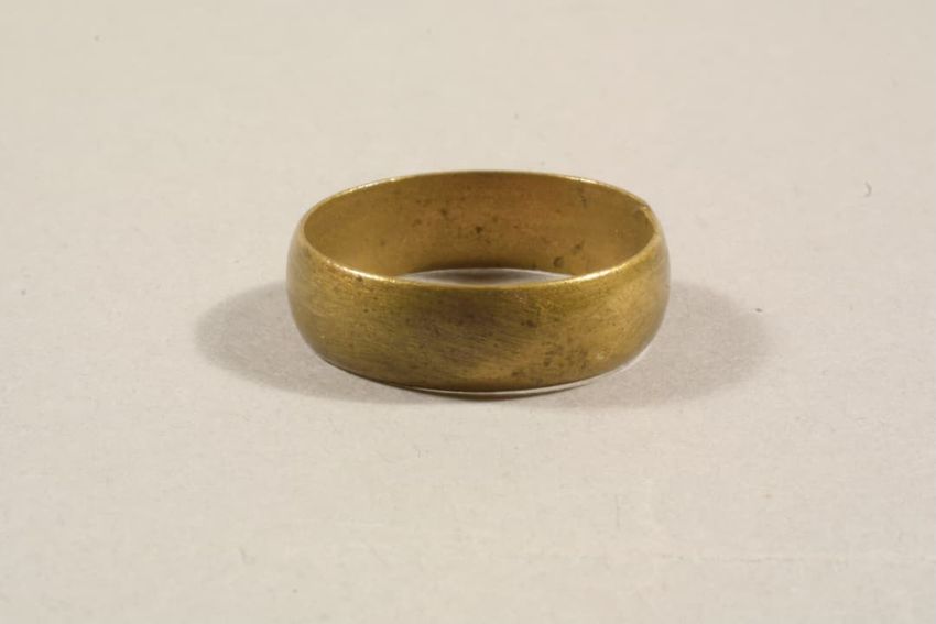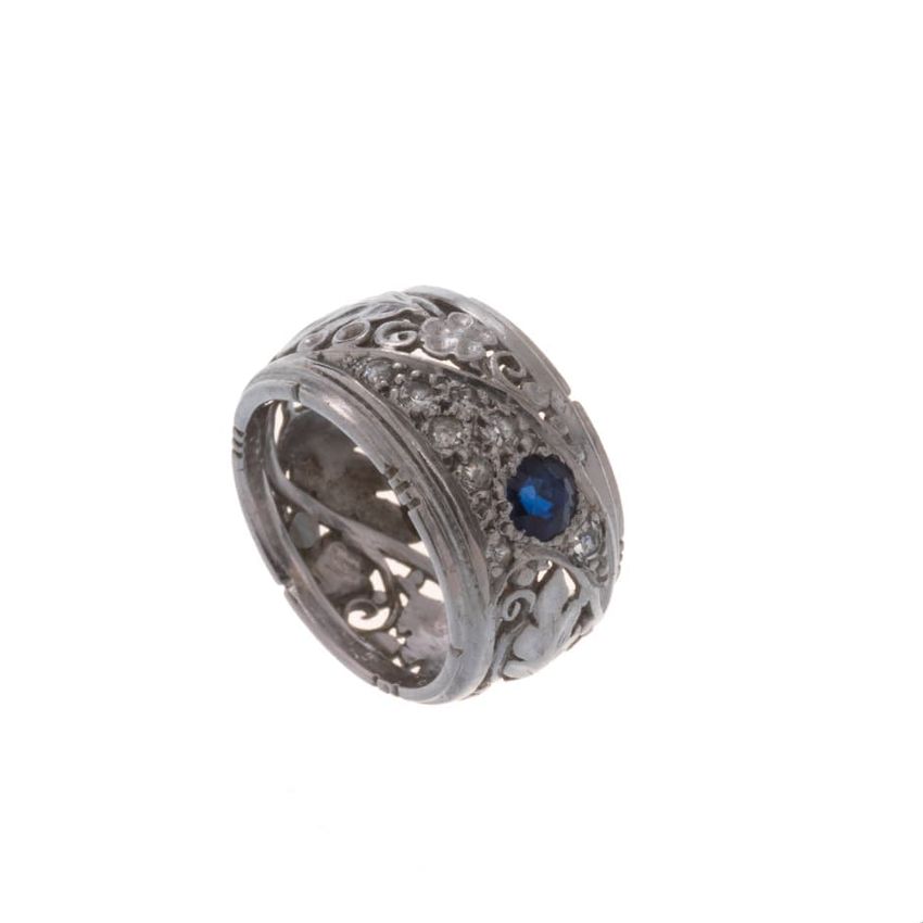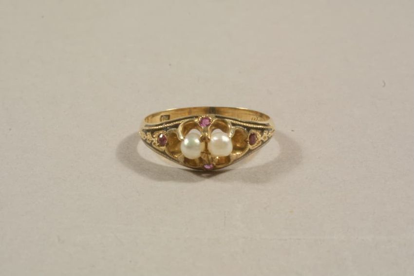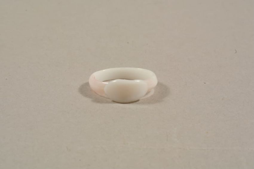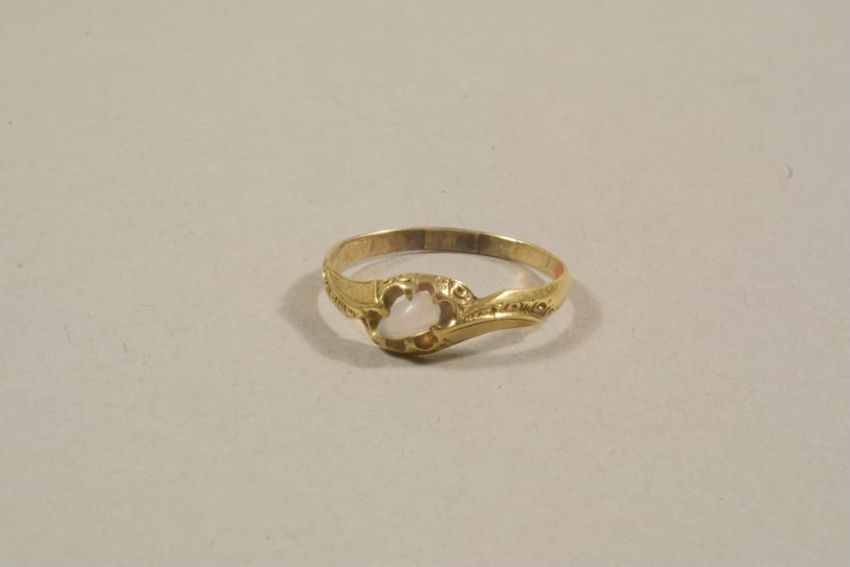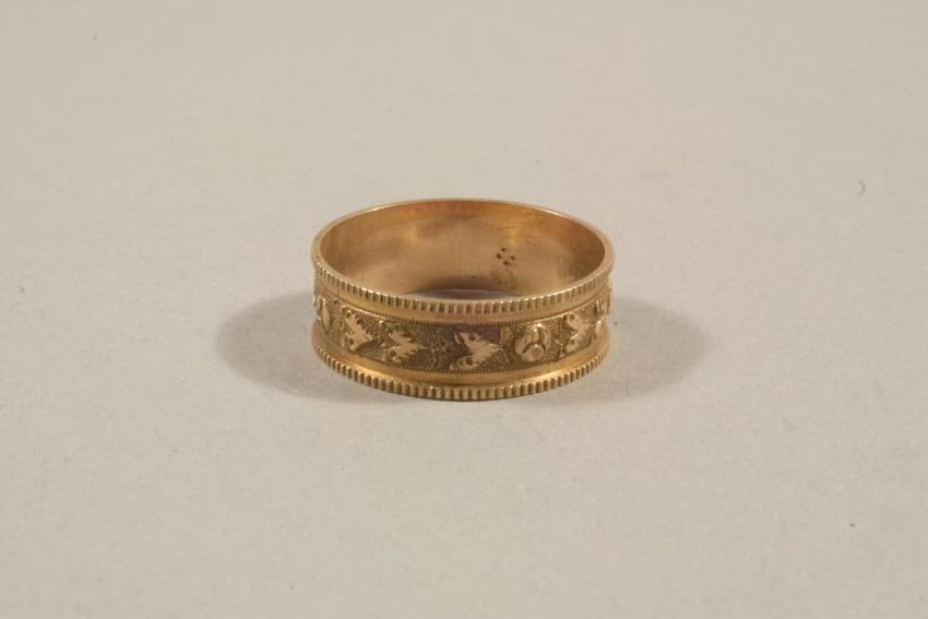 This ring is set with a rectangular, faceted paste stone over a gold twist cipher. Two smaller pastes flank each side. Fitting the eighteenth-century style, the pastes were set in silver, while the ring band is gold. The inside of the band is inscribed with a moral aphorism to the future wearer: "Le...