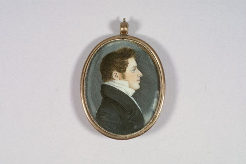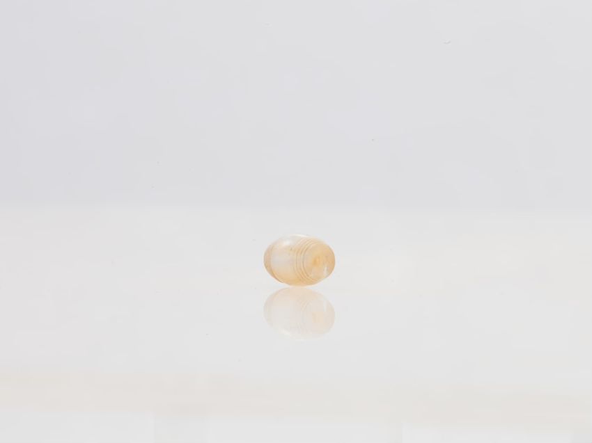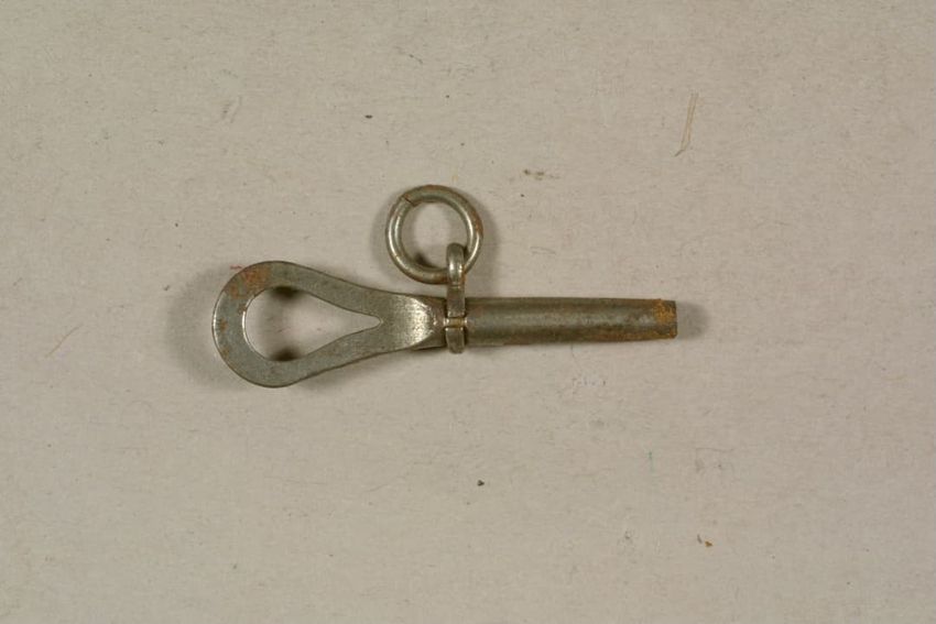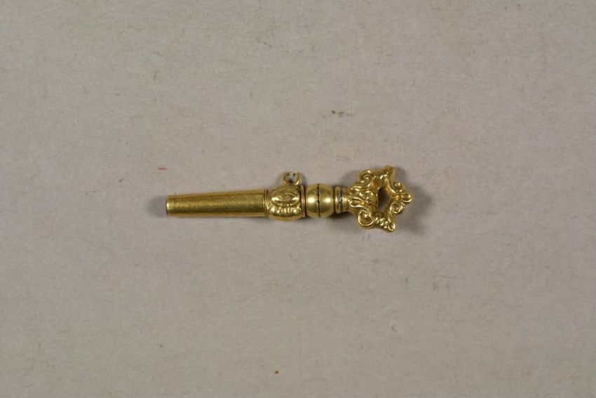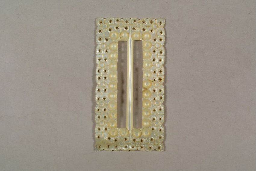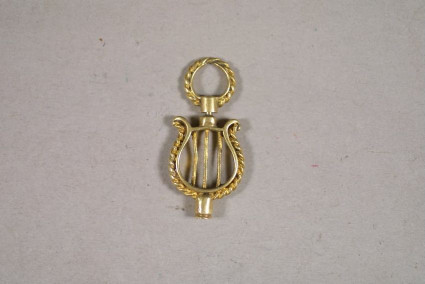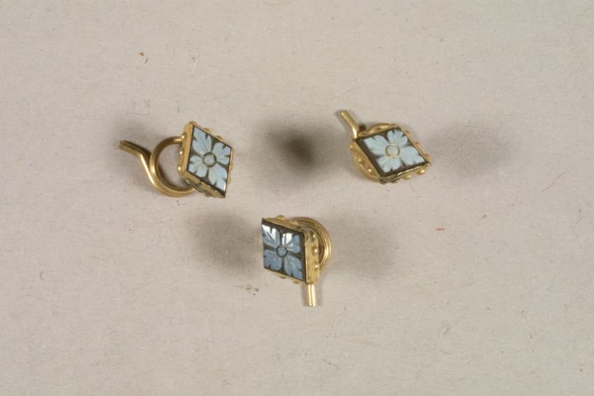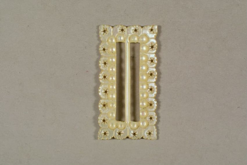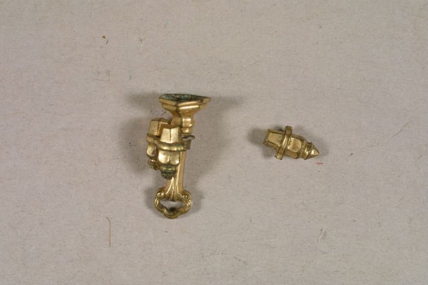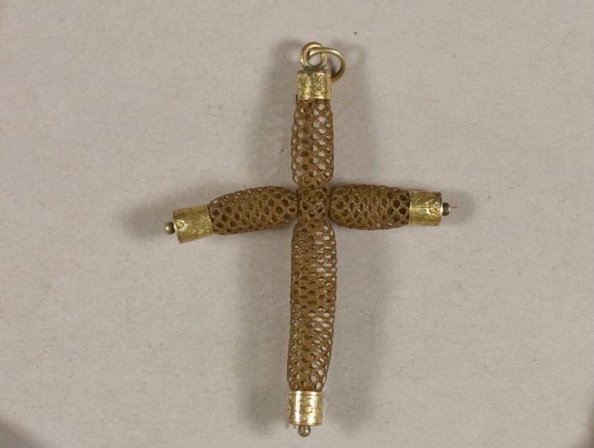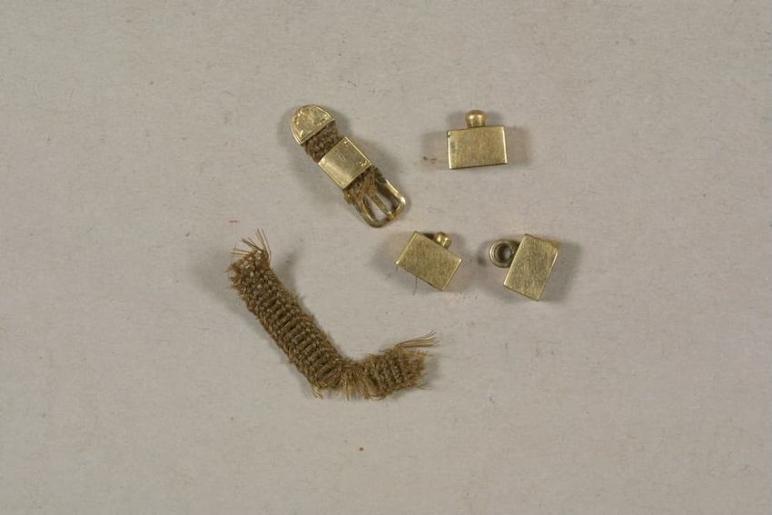 Hair ring with buckle-shaped gold finding. The hair has disintigrated, leaving the buckle, a small portion of the hair band, and gold findings, consisting of a pair of bead-decorated square end caps and what appears to be a slide or cap, with suspension ring attached to one side.