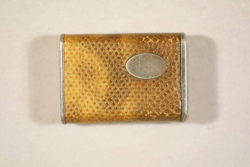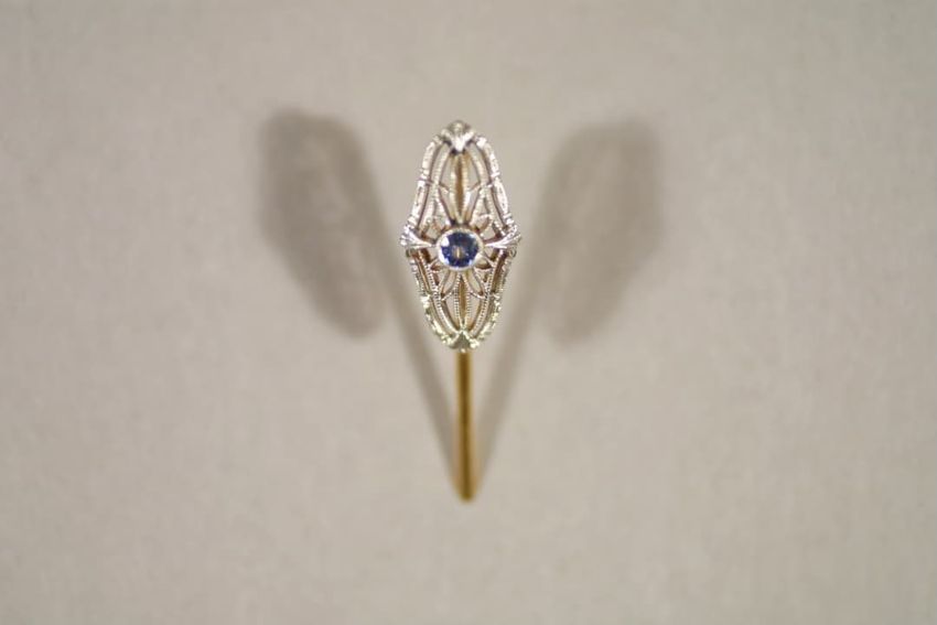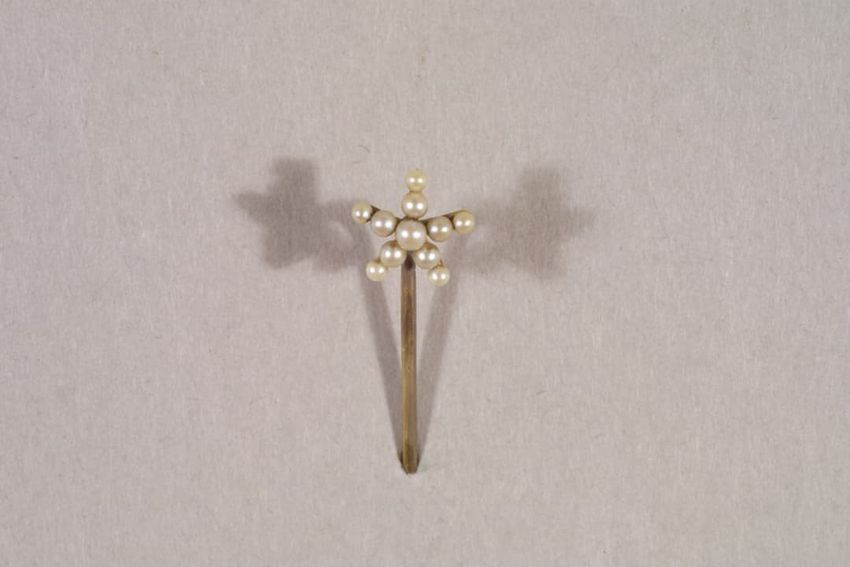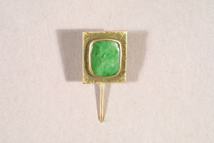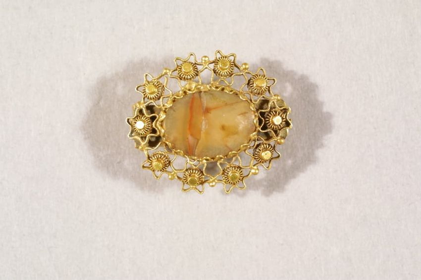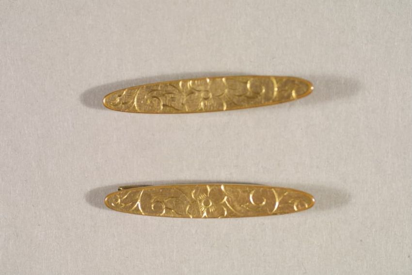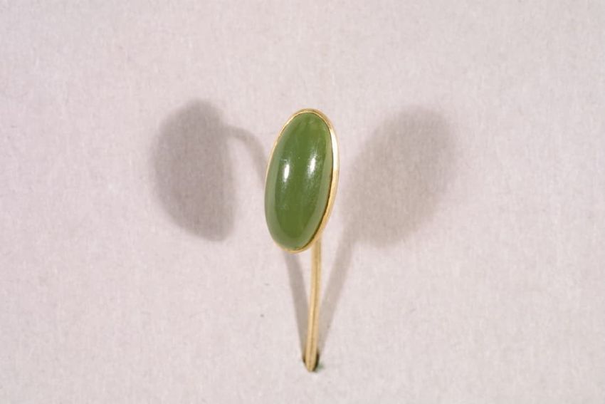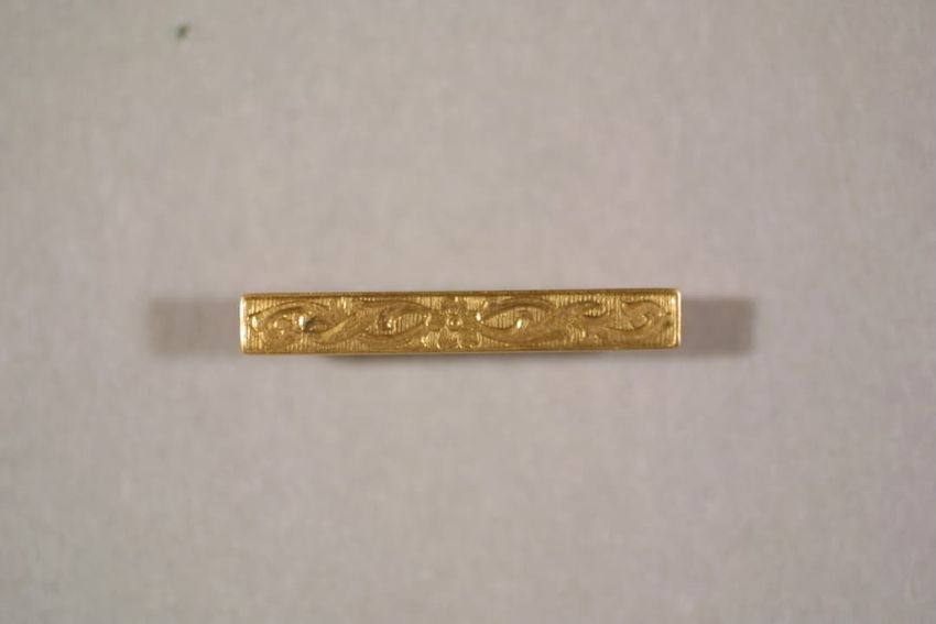This shield-shaped gold pin is embellished with a roaring lion in the center, surrounded by the French phrase "DIEU ET MON DROIT," which is the motto of the British Royal Family.