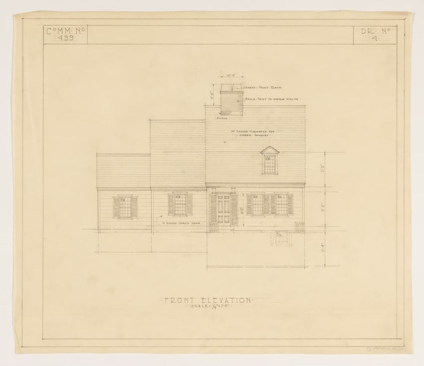 Set of ten architectural drawings of house for C. R. French in Montgomery County, Maryland (commission #499) including four elevations, three plans, two framing plans, and one detail. No drawings are dated or signed. Drawings depict a two-story Cape Cod-style house with one dormer, red cyrpus shi...
