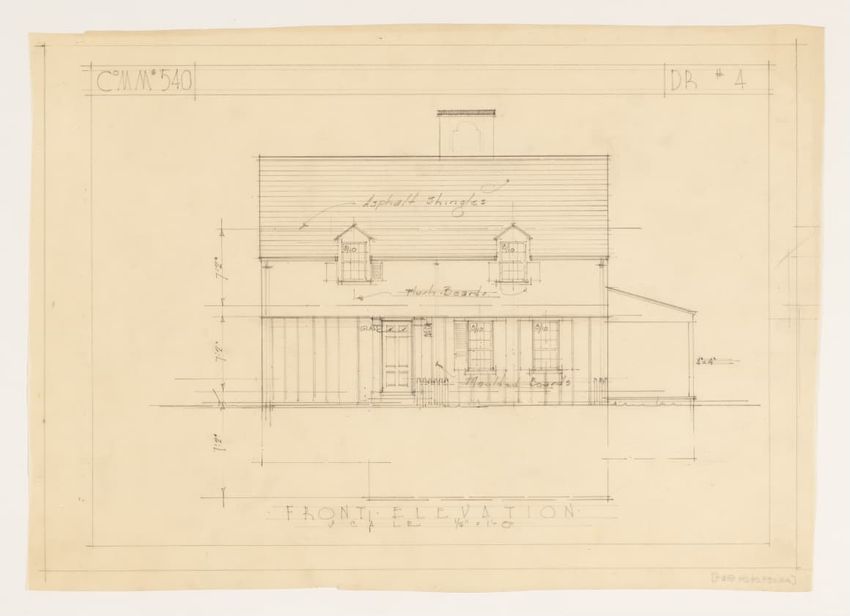 Set of eight architectural drawings of house for builder Vincent K. Cates in Lincoln, Massachusetts (commission #516) including three elevations, three plans, and two details. No drawings are dated or signed. Drawings depict a two-story Cape Cod-style house with a wood roof and a clapboard and sh...