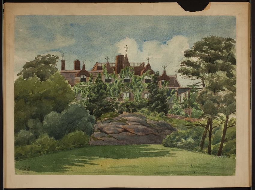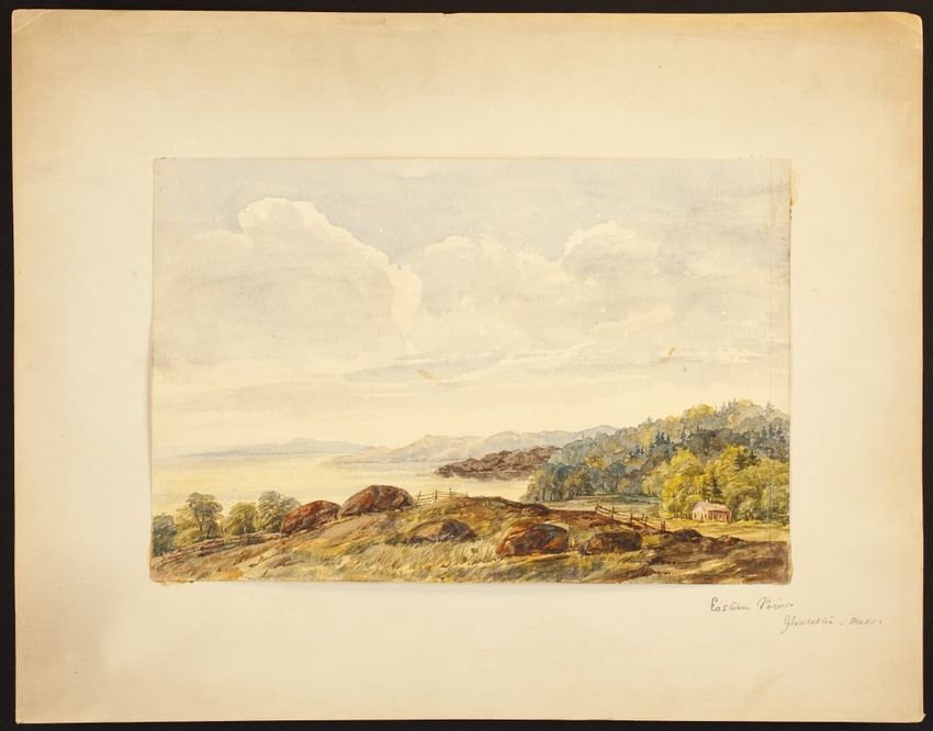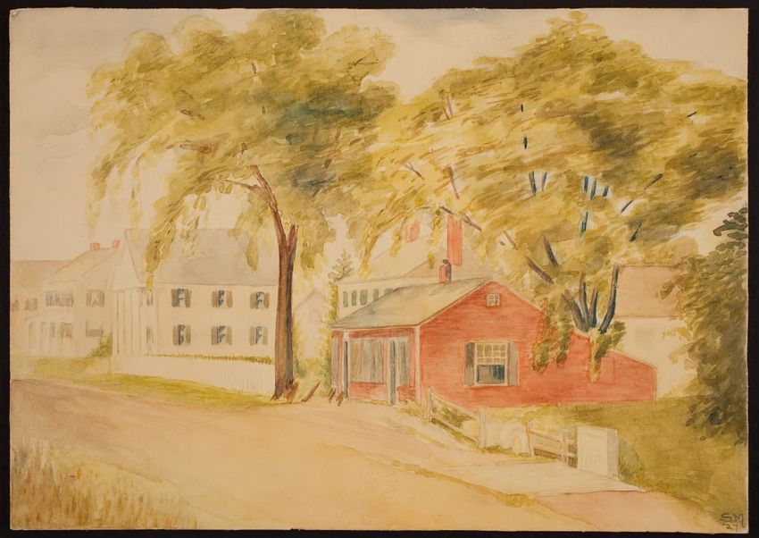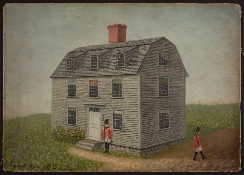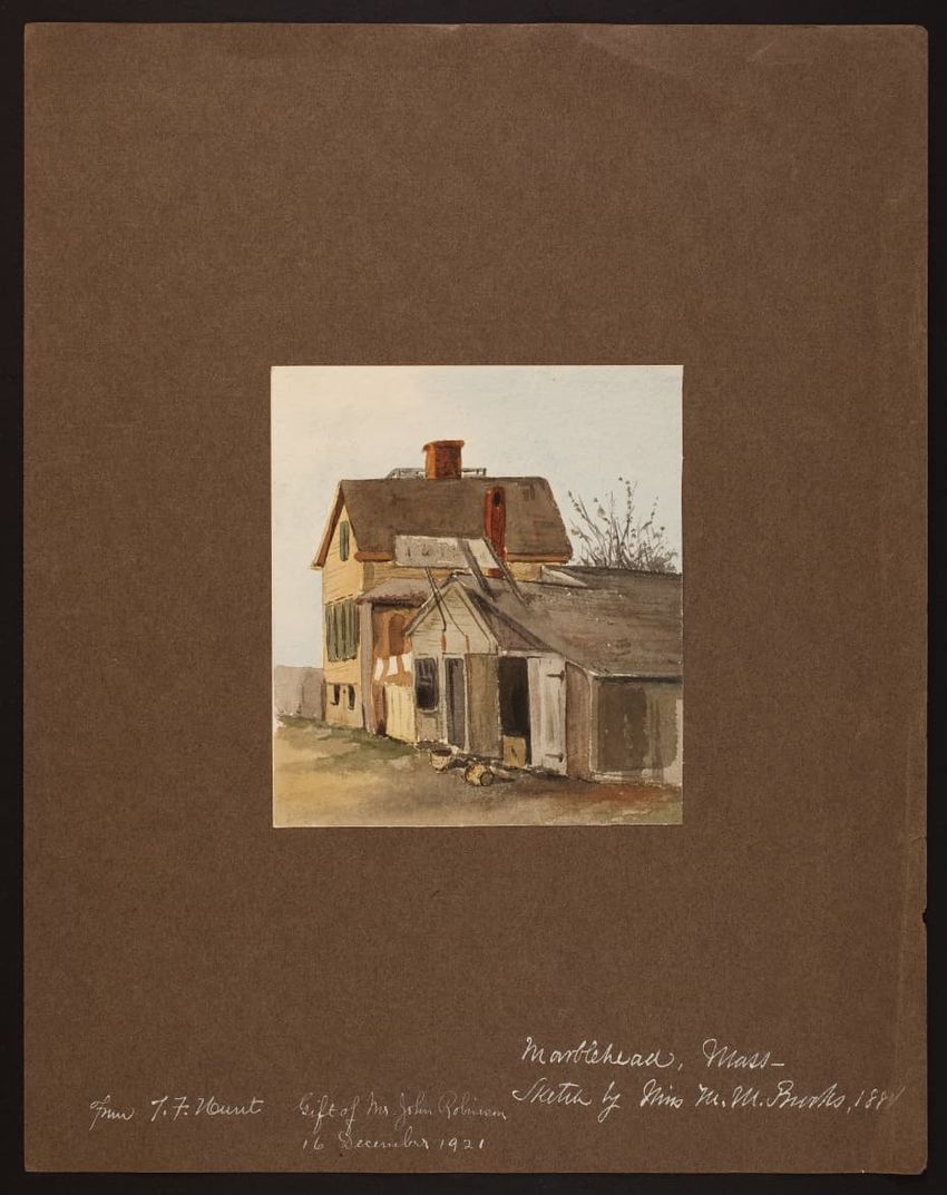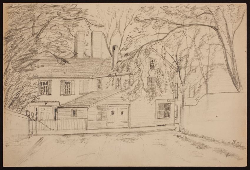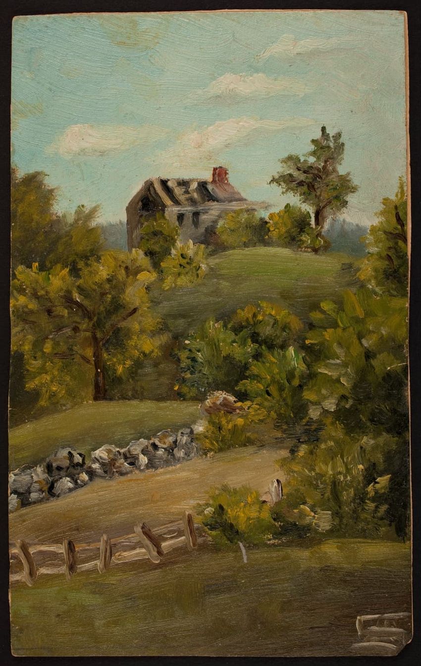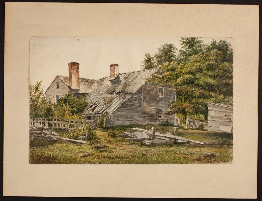 Very bright - multi-pasteled picture of house amid yard and trees. Seen from rear and side. Brook flows nearby. Bright green, pink, yellow colors. Attached newspaper clipping on back titled "Taxed in three towns but never was moved", meaning area where house stands has been part of Lynn, Melrose, an...