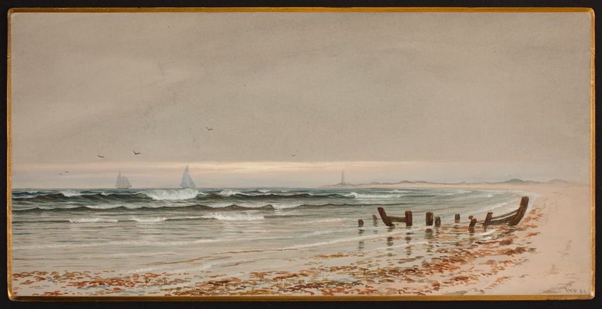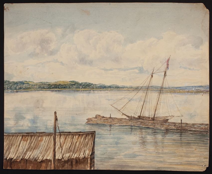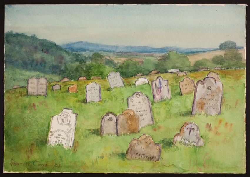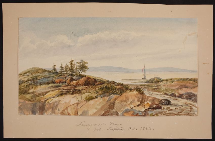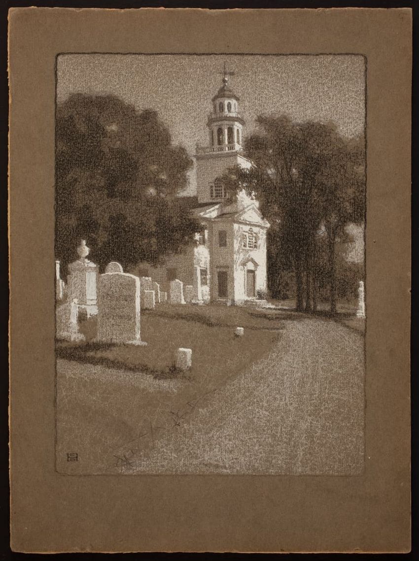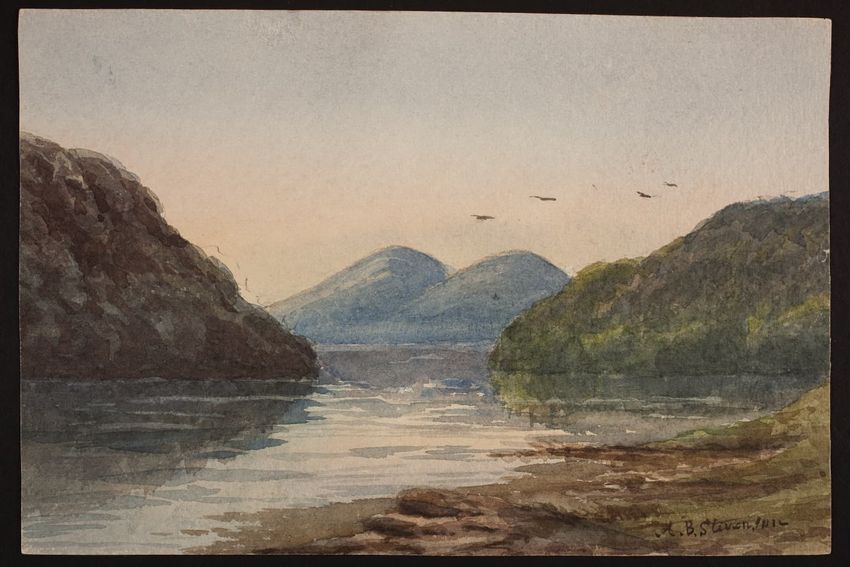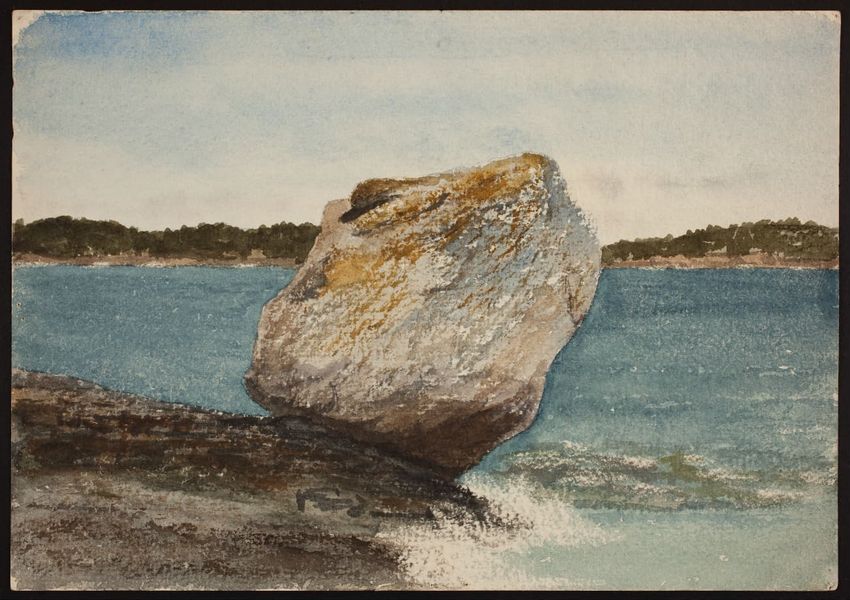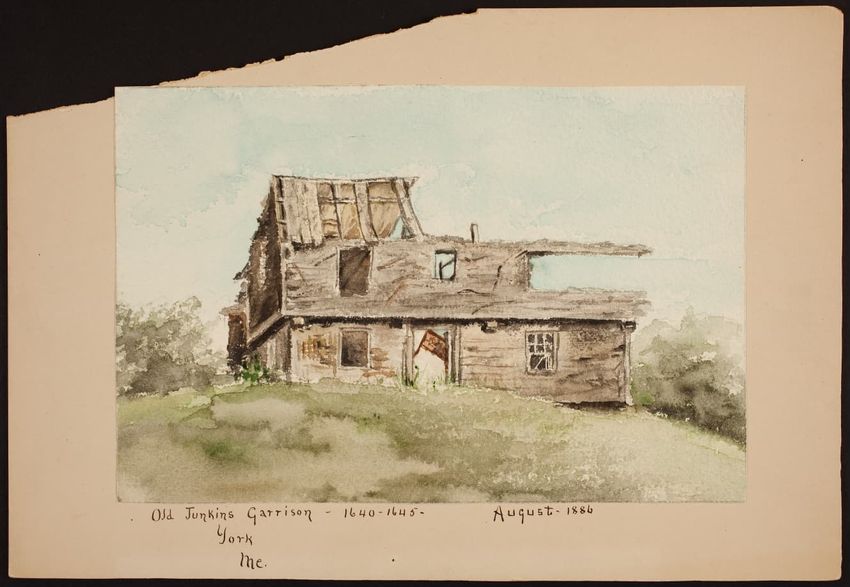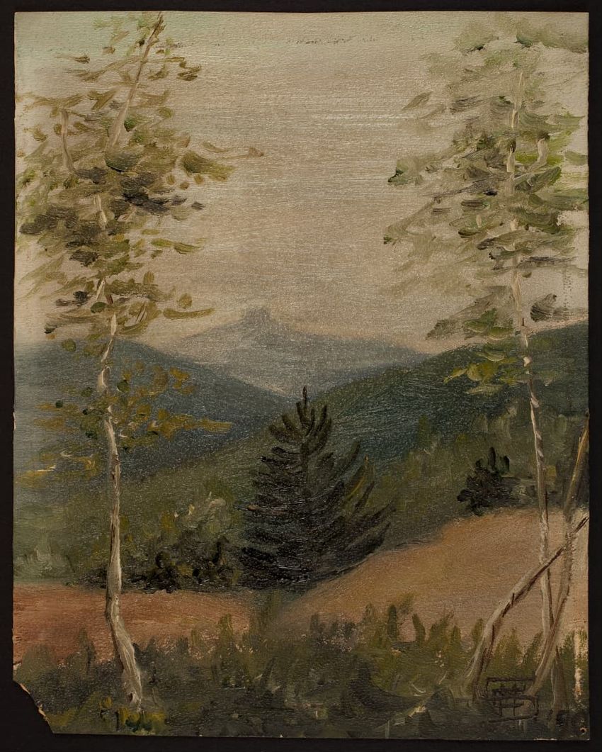 Very bright - multi-pasteled picture of house amid yard and trees. Seen from rear and side. Brook flows nearby. Bright green, pink, yellow colors. Attached newspaper clipping on back titled "Taxed in three towns but never was moved", meaning area where house stands has been part of Lynn, Melrose, an...