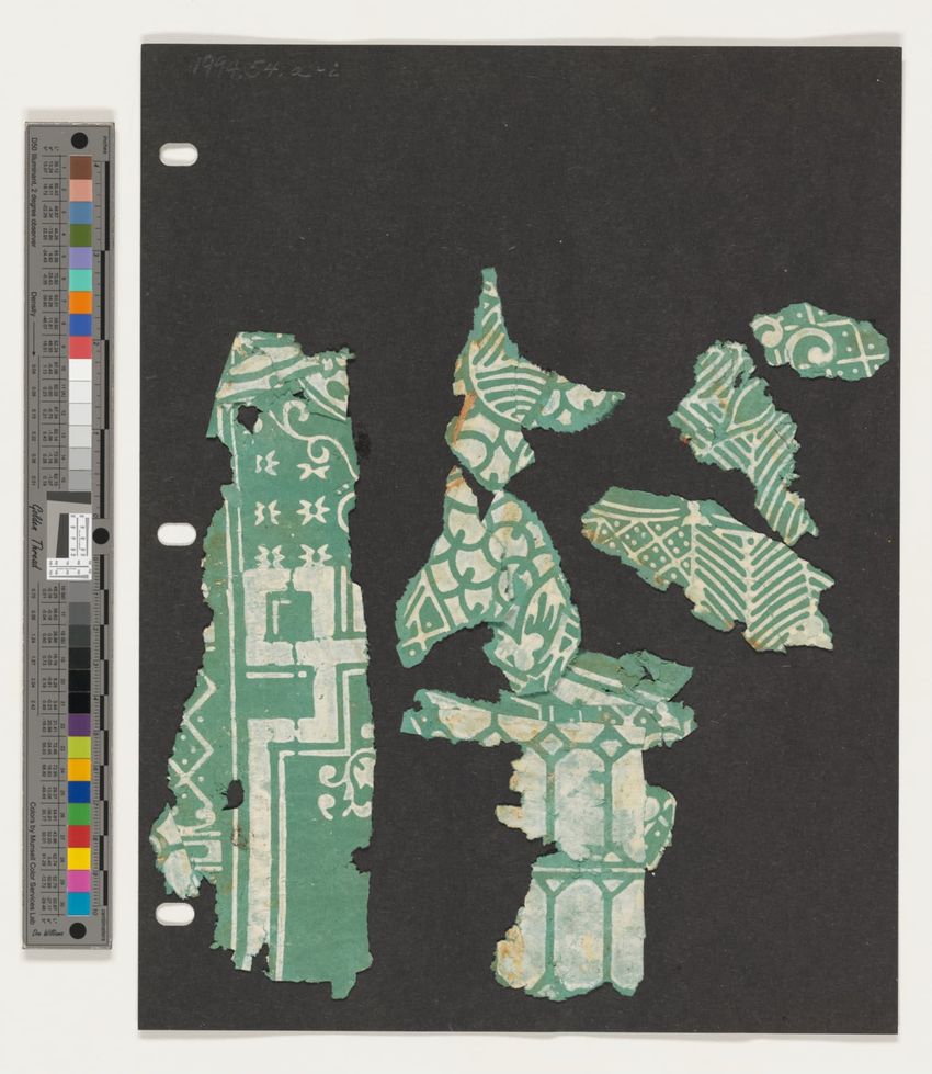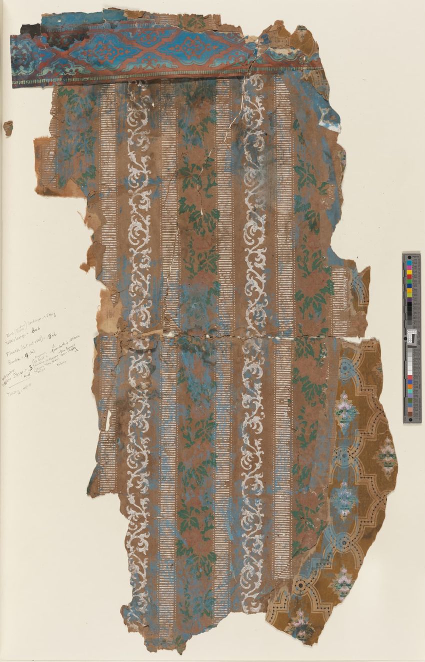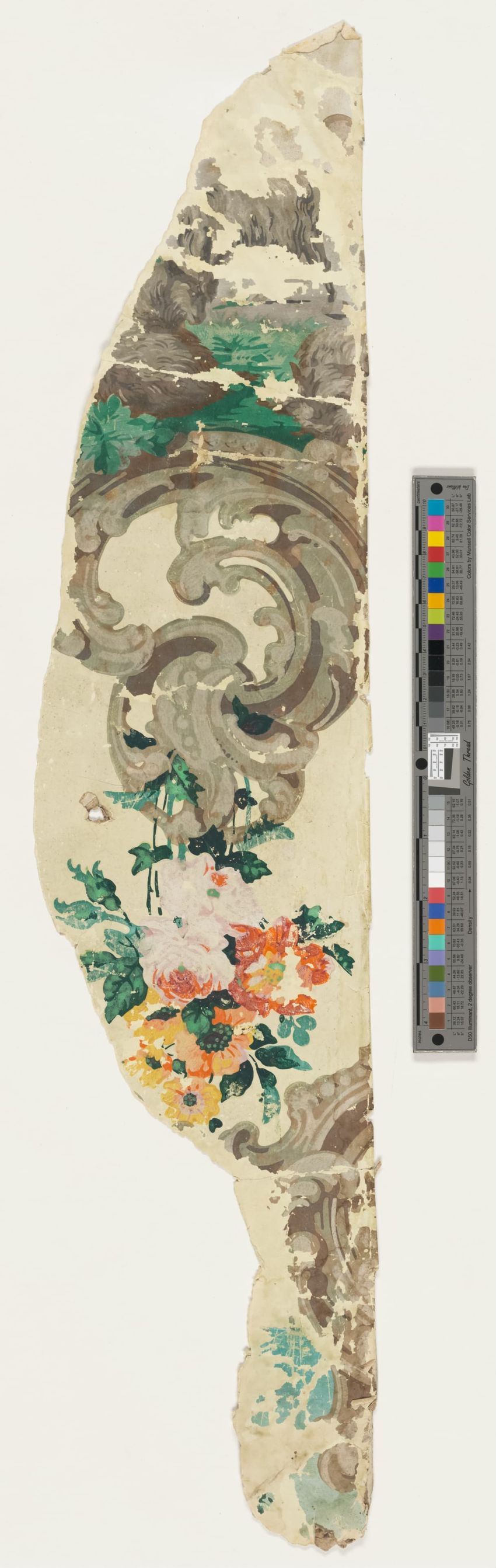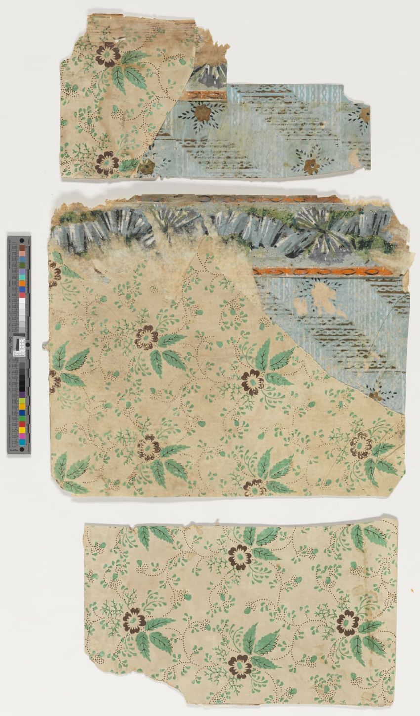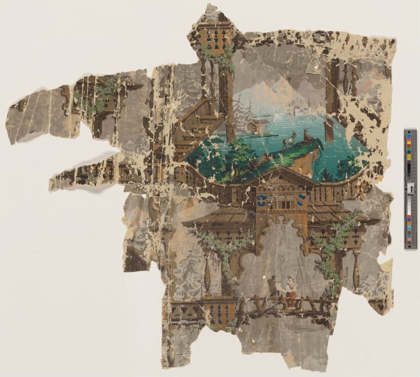 Scenery figure wallpaper fragment from Salem, Massachusetts. Pastoral scene of children in wooded setting playing on a see-saw made from a stump and log. Block-printed in black, red, light tan, pale yellow, dusty pink, pale mauve and multiple shades of gray, brown, green, and blue on a light blue-...