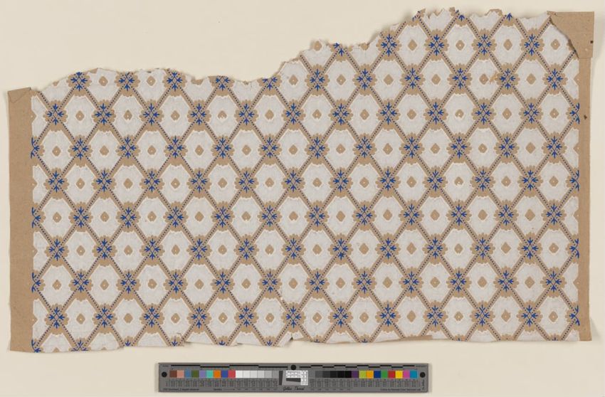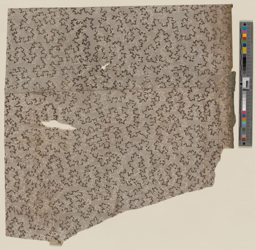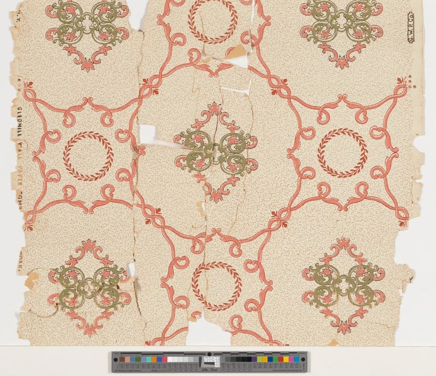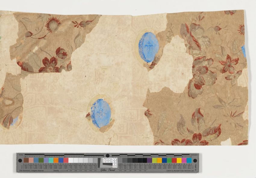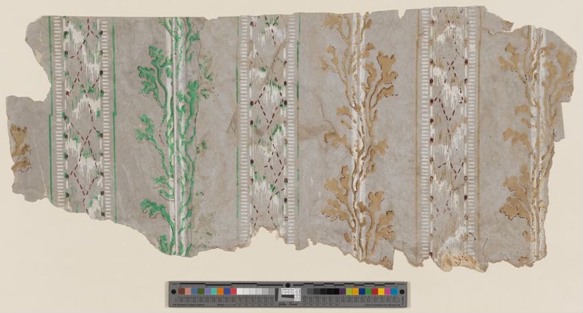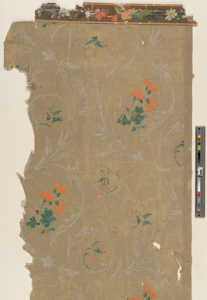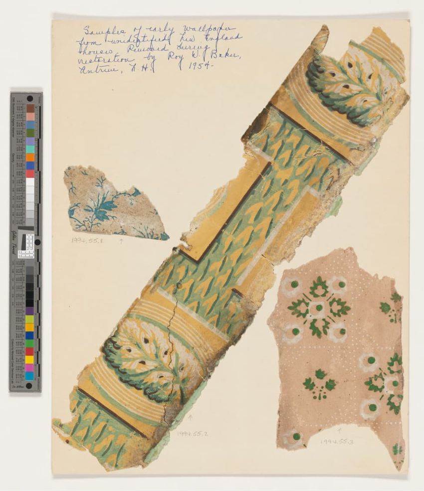 Scenery figure wallpaper fragment from Salem, Massachusetts. Pastoral scene of children in wooded setting playing on a see-saw made from a stump and log. Block-printed in black, red, light tan, pale yellow, dusty pink, pale mauve and multiple shades of gray, brown, green, and blue on a light blue-...