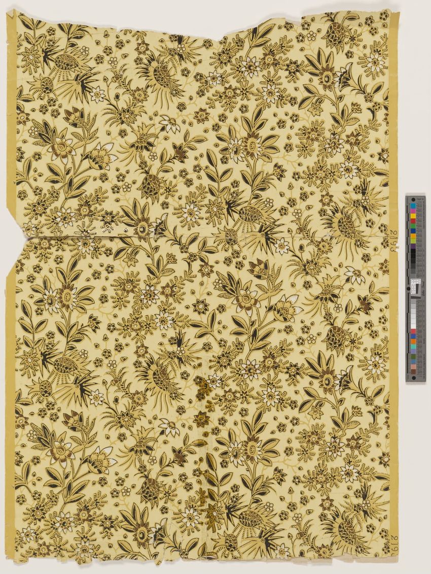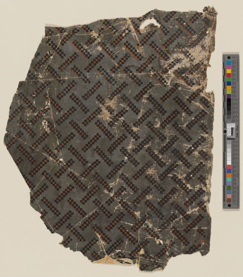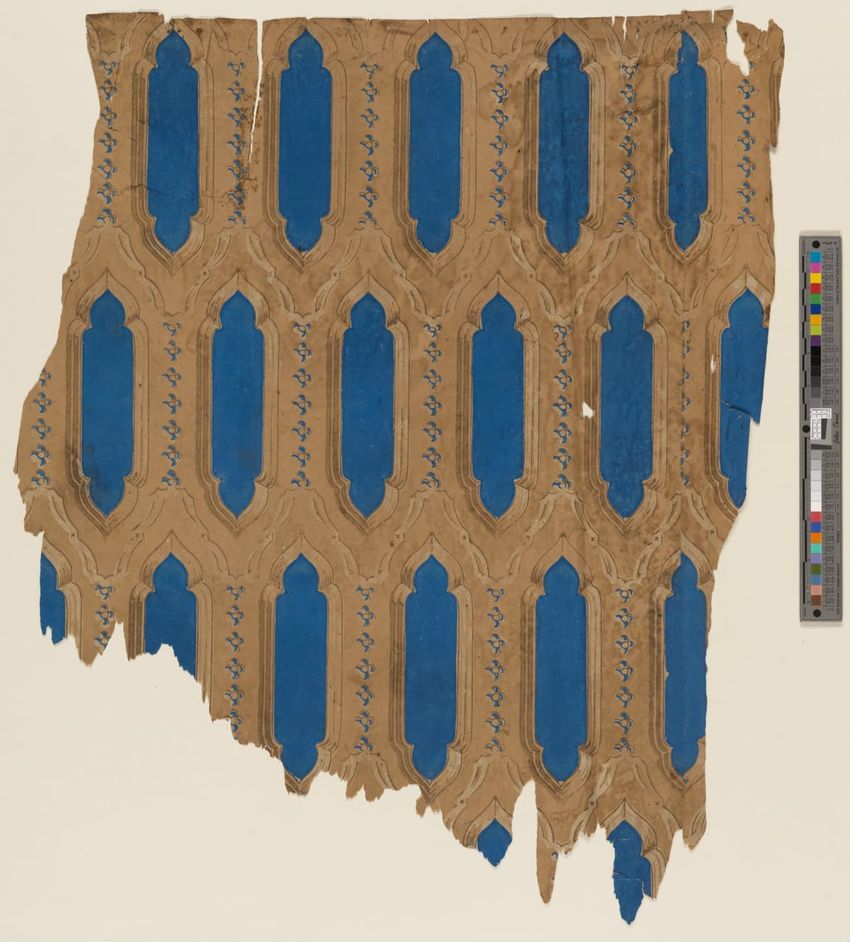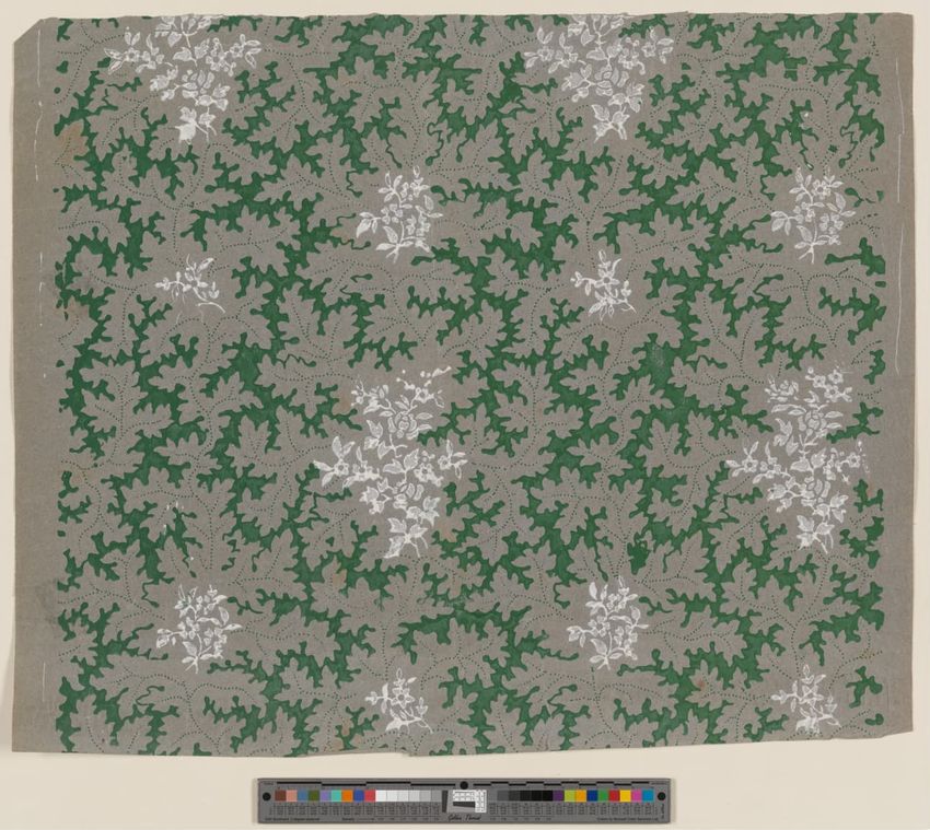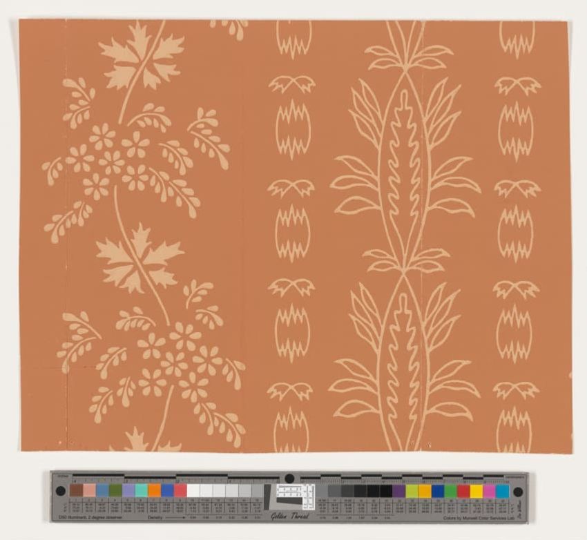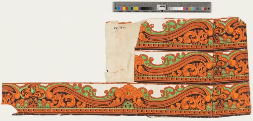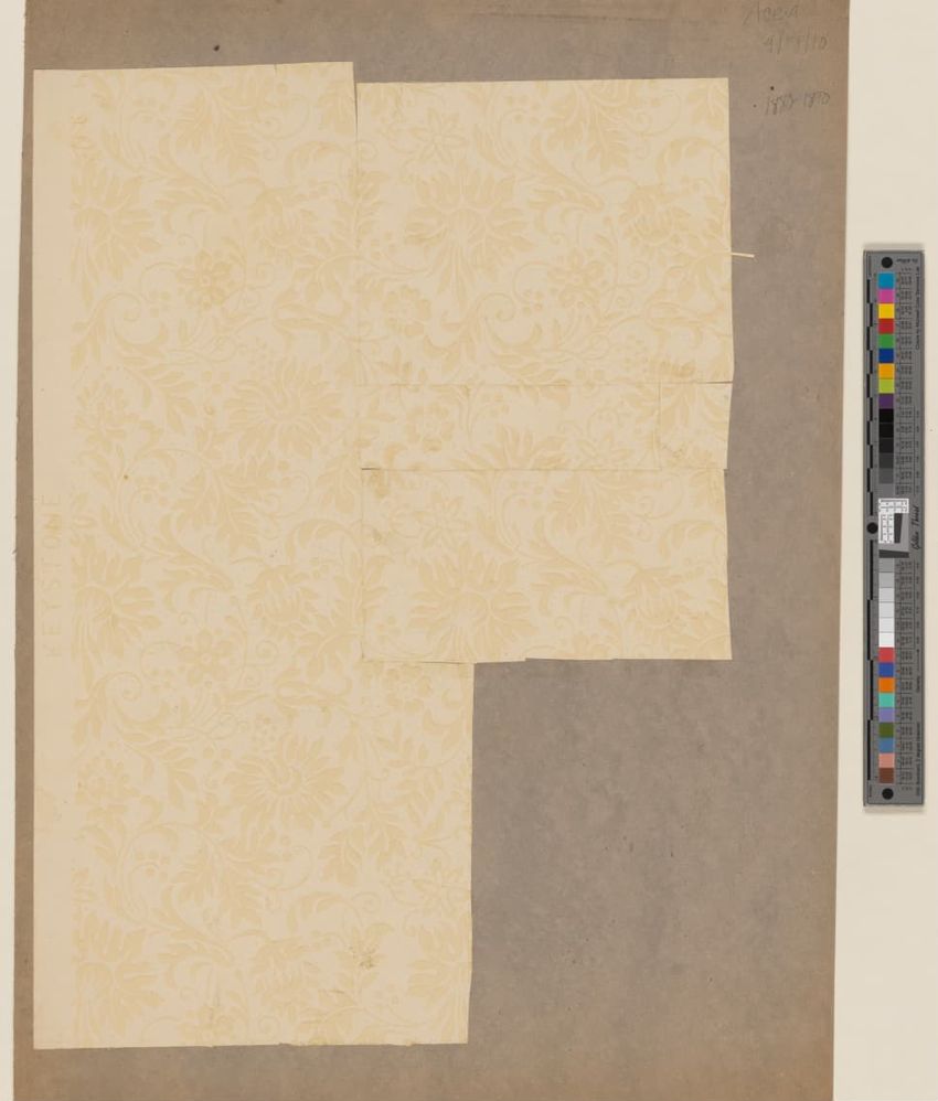 Scenery figure wallpaper fragment from Salem, Massachusetts. Pastoral scene of children in wooded setting playing on a see-saw made from a stump and log. Block-printed in black, red, light tan, pale yellow, dusty pink, pale mauve and multiple shades of gray, brown, green, and blue on a light blue-...