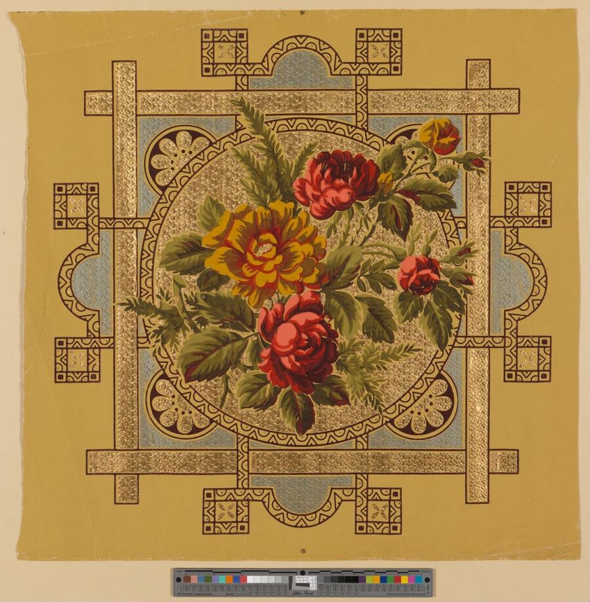 Unused sample. Embossed paper. Meandering tree branch with exotic flowers, cherries, berries, pears, pomegranates, and pineapple on geometric patterned, embossed field. Printed in brown, taupe, and tan on a green ground. Drop match.