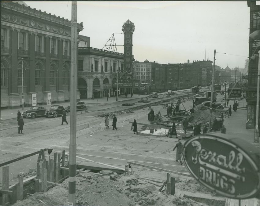 A construction fence can be seen on the left side in front of Horticultural Hall and the Uptown Theatre. Construction activity is taking place on both sides of the street. The Strand Theatre, Mechanics Hall, and the Copley Square Hotel can be seen on the left side of the image. A policeman stands in...