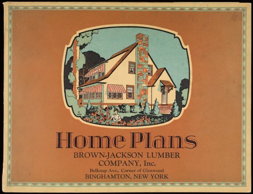Curtis Woodwork is promoted in the plan book. Floor plans are available through Brown-Jackson Lumber Company, Inc., Belknap Avenue, corner of Glenwood, Binghamton, New York. Photographic prints of designs accompany the floor plans.
