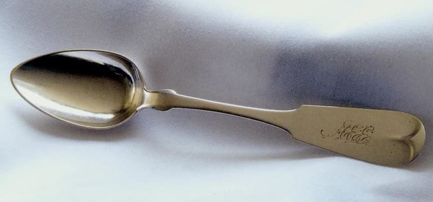 Framed black and white engraving of Albrecht Durer's St. Eustace. In an outdoor scene, a man kneels on the ground with his hands extended toward the head of a horse. Five dogs in the foreground. Scene is taking place in the middle of a forest landscape, next to a pond.