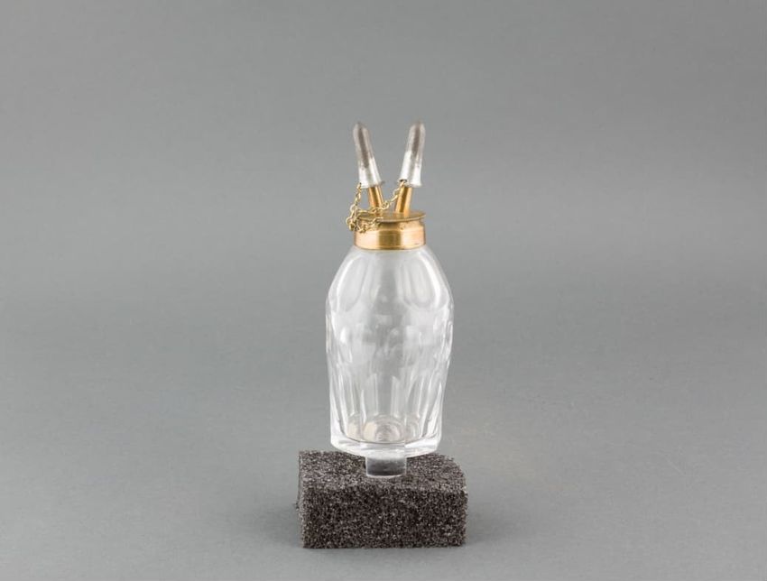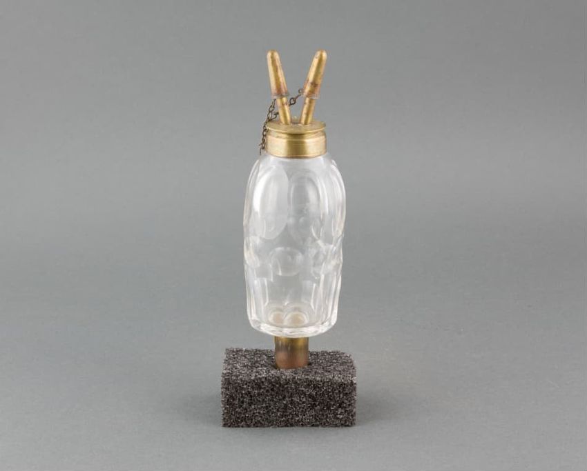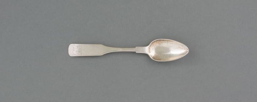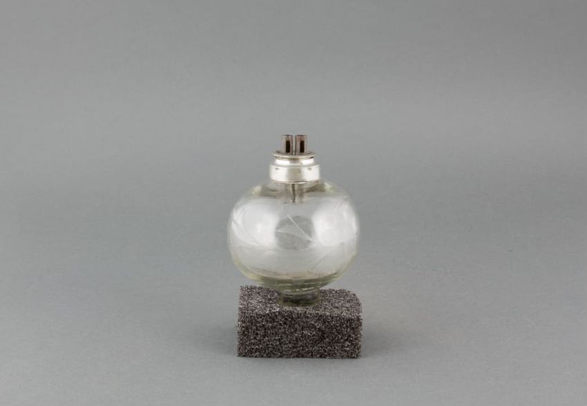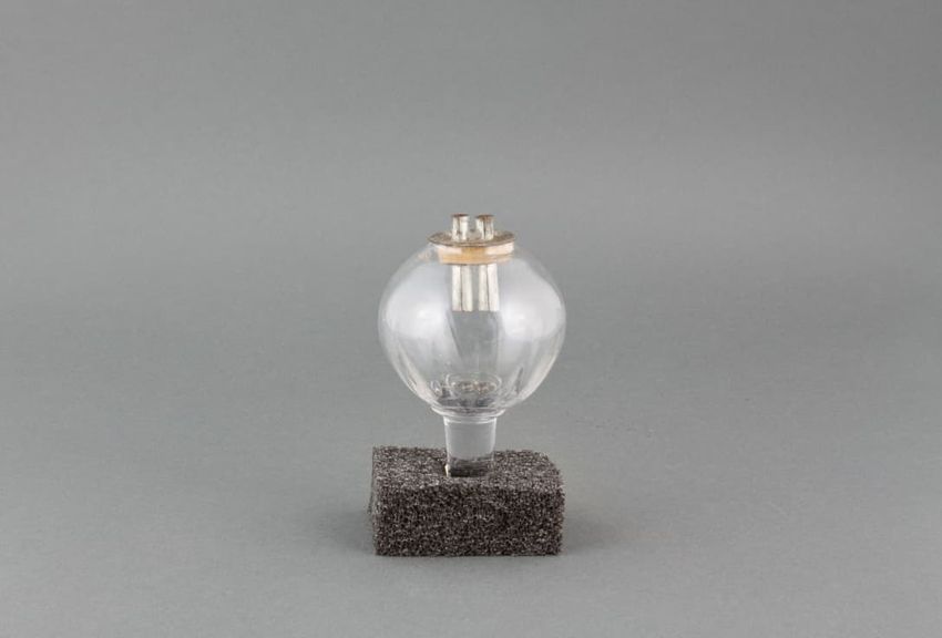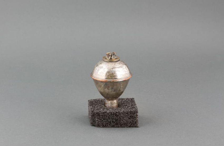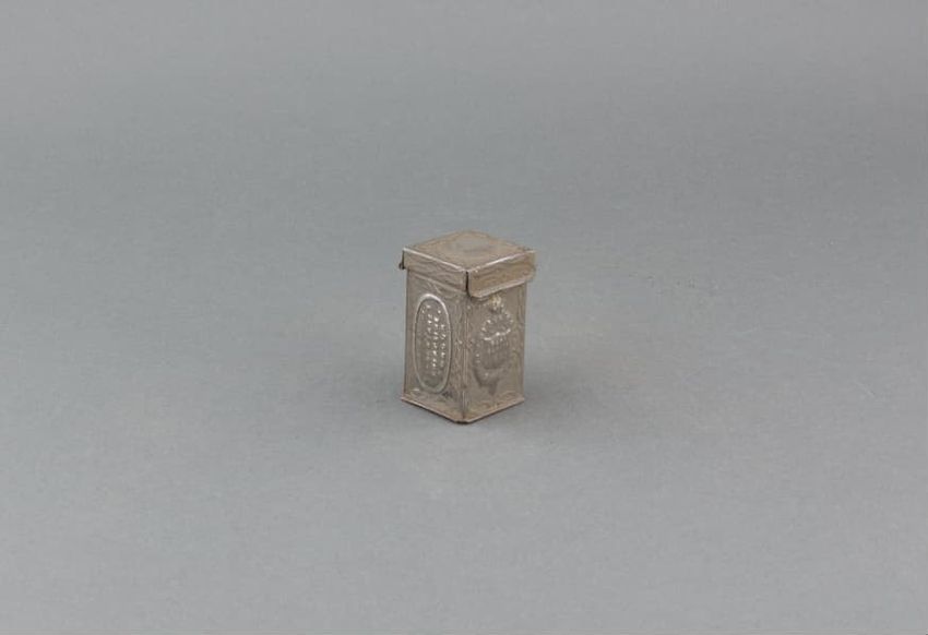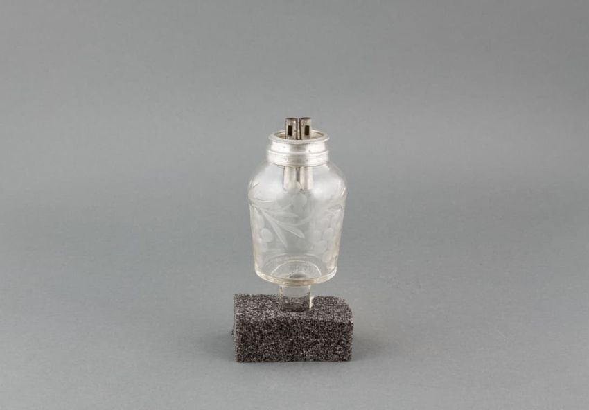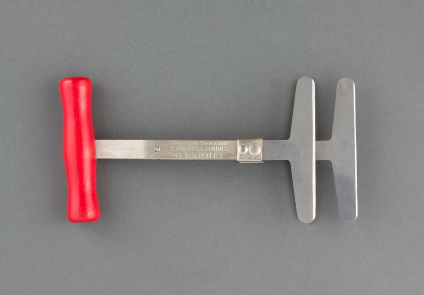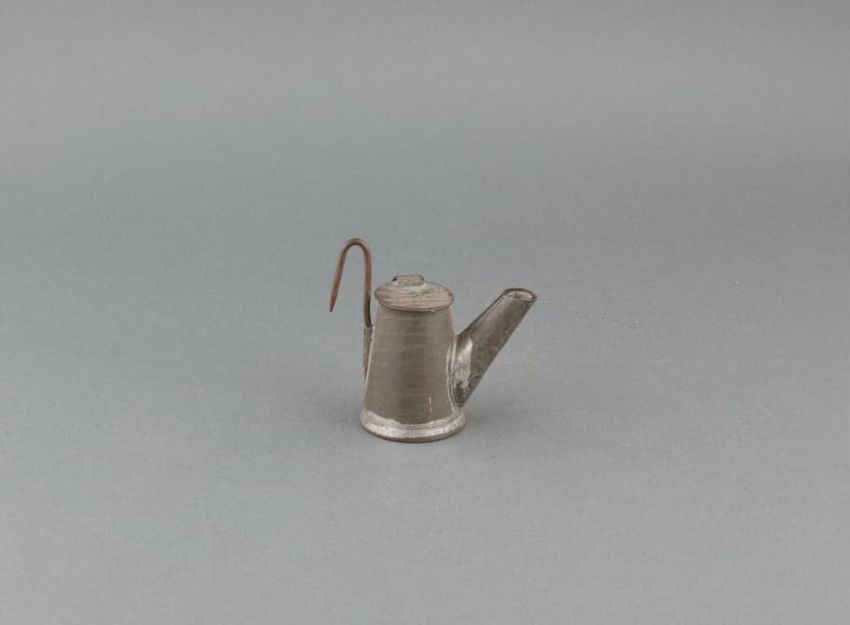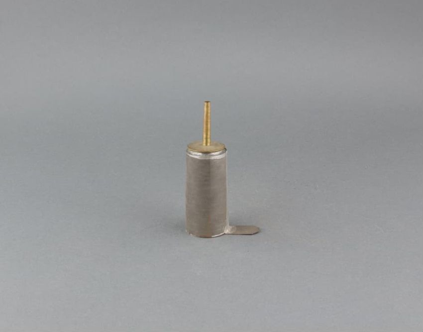 Metal potato mashing tool. Perforated, cylindrical metal basket held by black metal handle. Handle hinges in front to upper handle with plunger. When handles are brought together, plunger squeezes a cooked potato placed in the basket, mashing it and forcing it out through the basket's perforated ho...