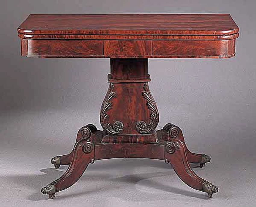 Grecian-style rectangular card table has folding top that swivels to open. Top rest on an lyre-shaped pillar with leaf carvings ending in rosettes. The pillar stands on a base supported by scrolled legs with applied disks, ending in brass casters. The frame has a veneered frieze with a rectangular t...