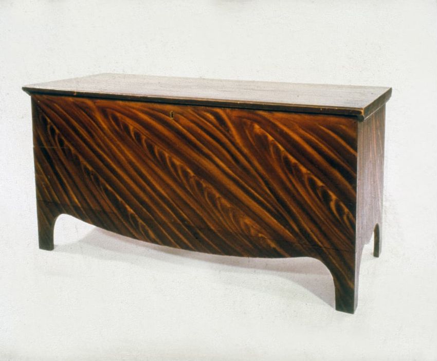 mahogany (wood), crotch mahogany, eastern white pine (wood), veneer, brass (alloy), enamel (fused coating)