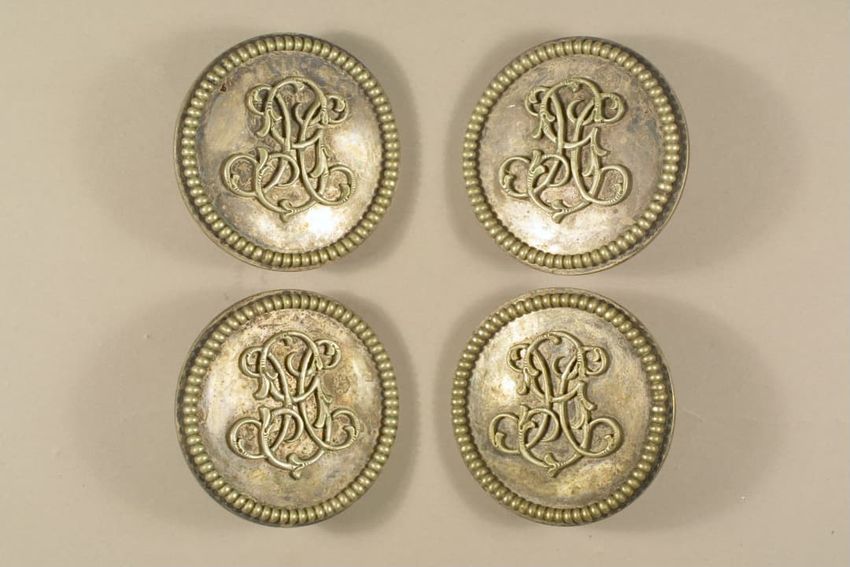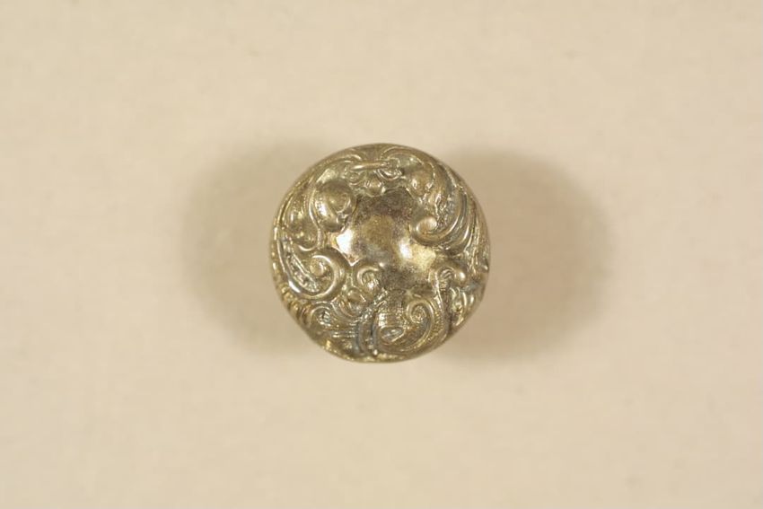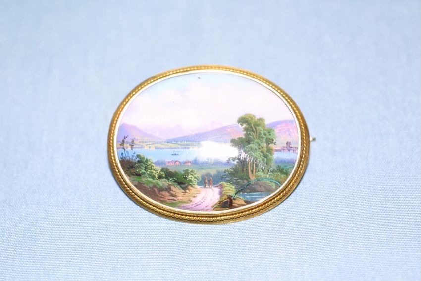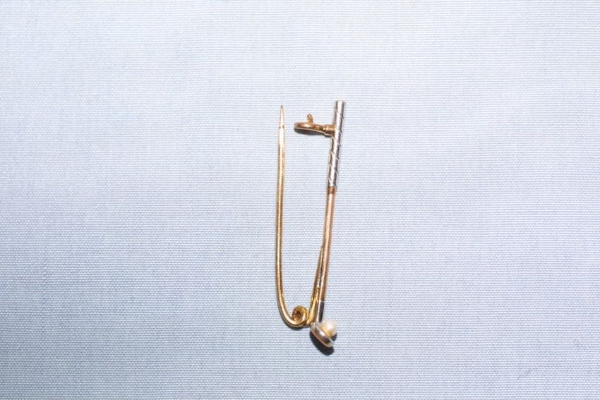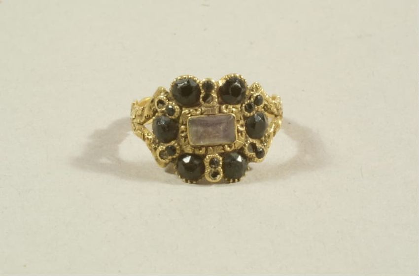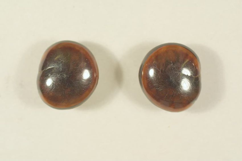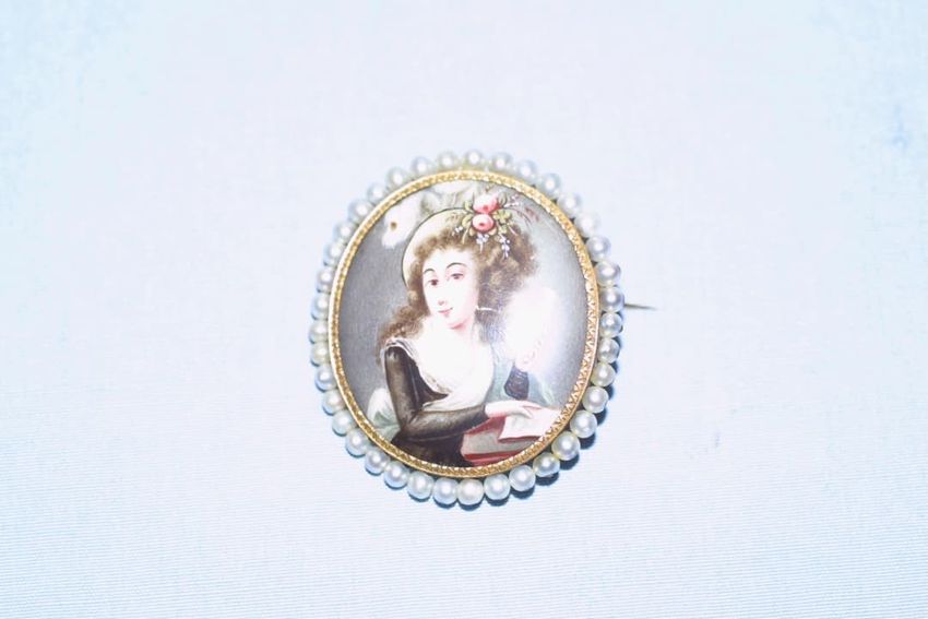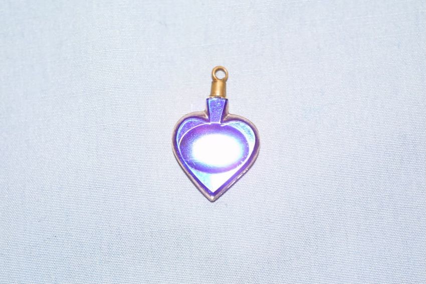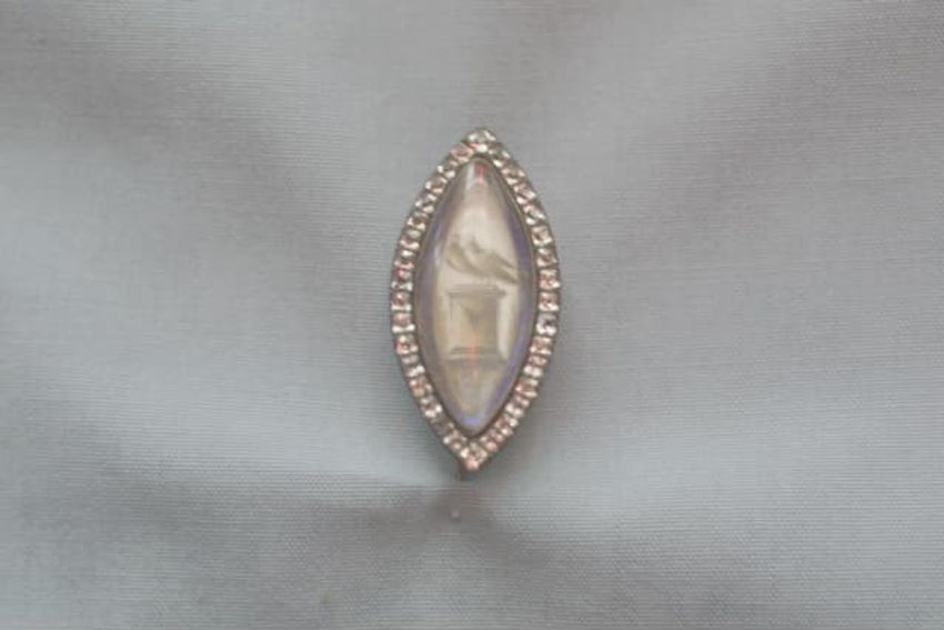 Blue glass and cut steel brooch set in silver, two round glass plaques with cut steel flowers in center, surmounted by crown with cut steel beads, tear drop glass pendant, hinged pin and hook on reverse.
