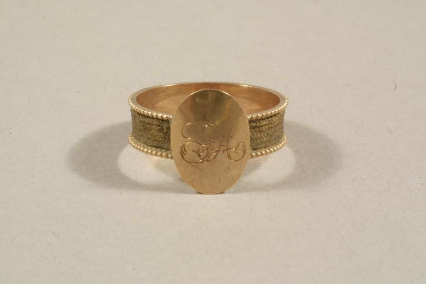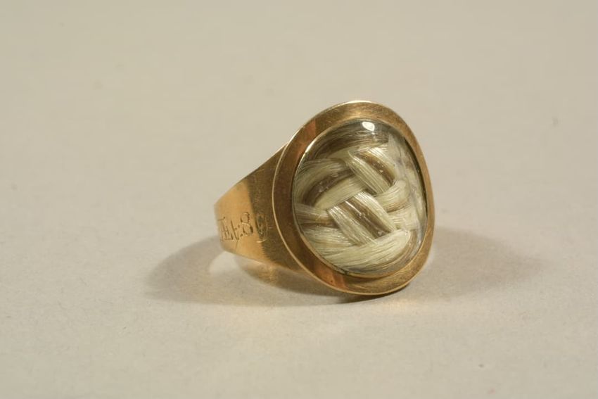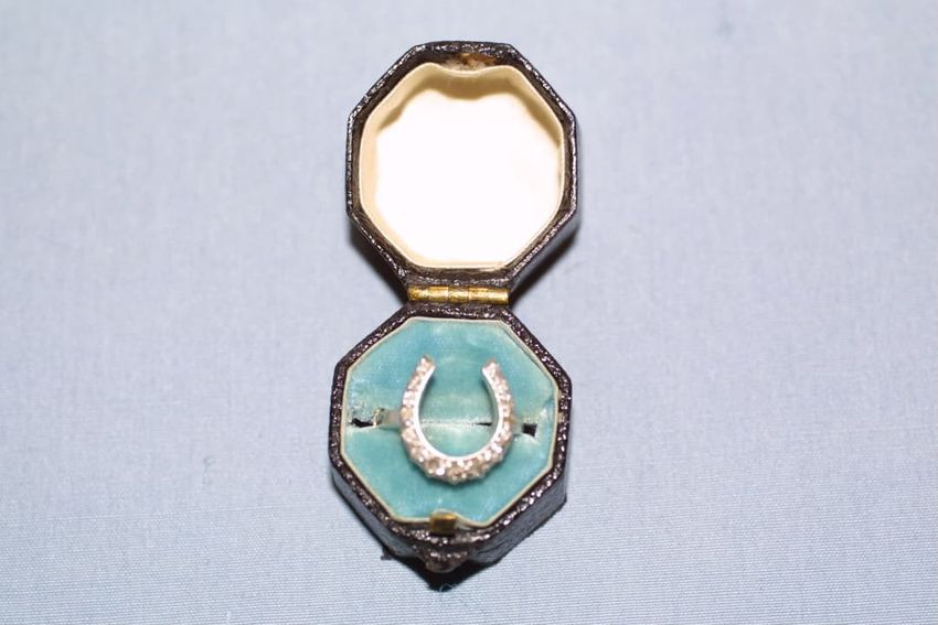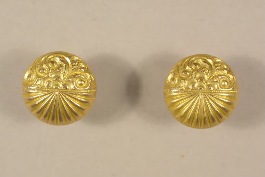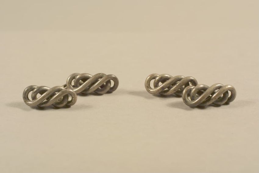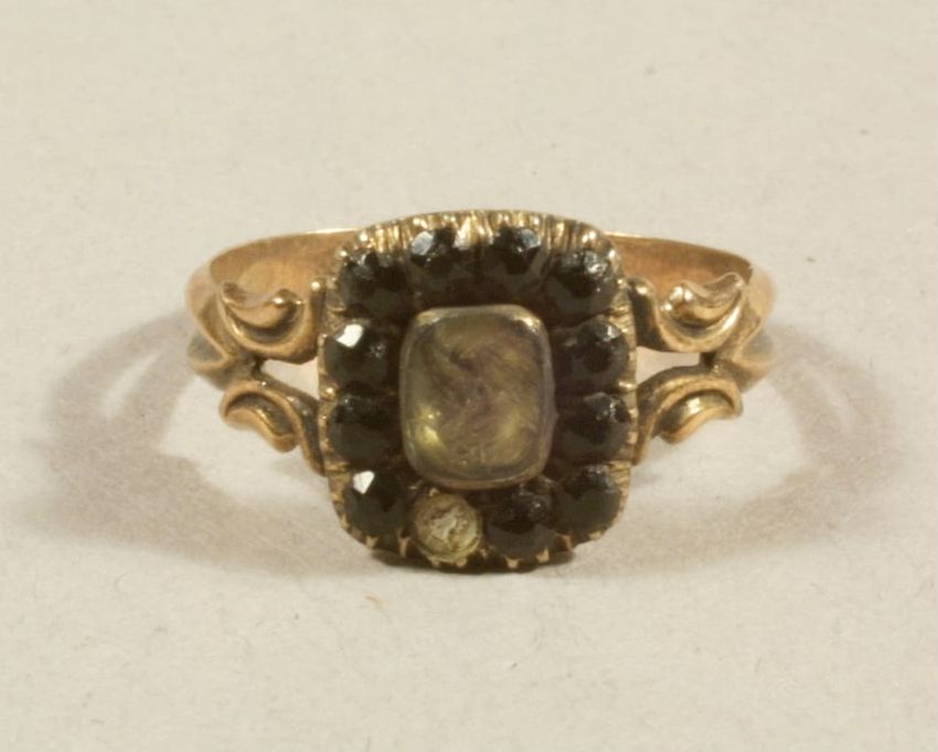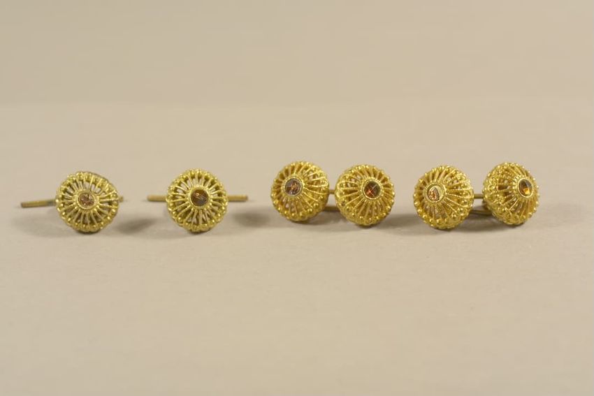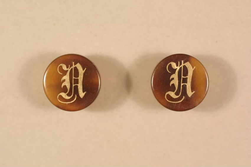Blue glass and cut steel brooch set in silver, two round glass plaques with cut steel flowers in center, surmounted by crown with cut steel beads, tear drop glass pendant, hinged pin and hook on reverse.