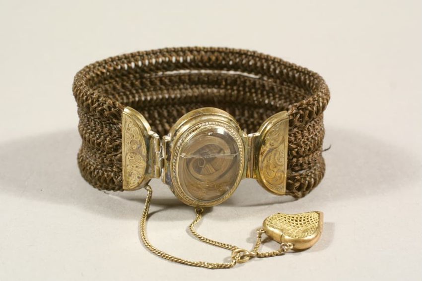 glass (material), gold (metal), human hair, ivory (tooth component)